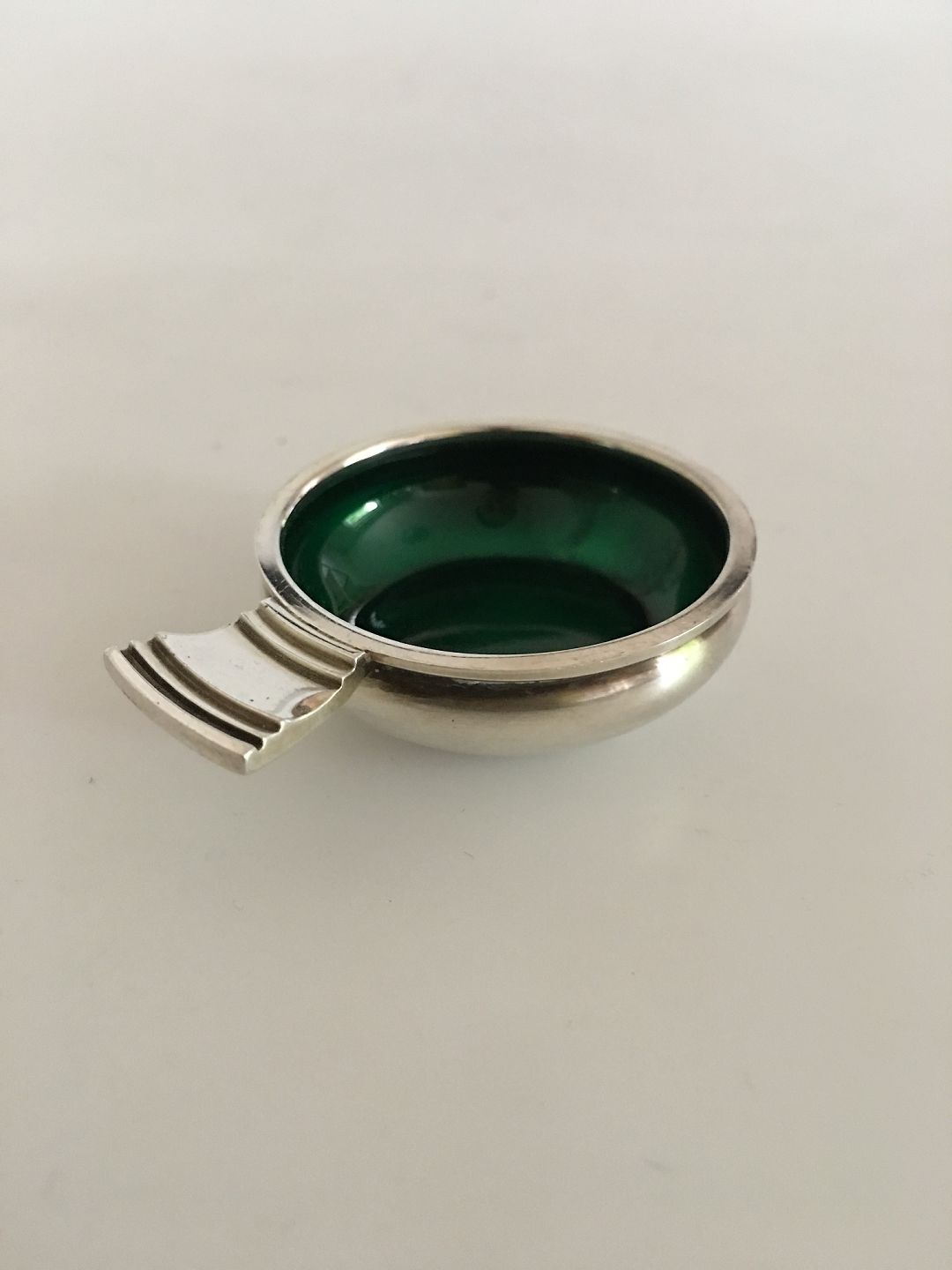 Georg Jensen Antik Sterling Sølv Saltkar No.4 med Grøn Emalje. 1.5 cm H. Ca. 4 cm Ø. I fin stand. Fra efter 1945.