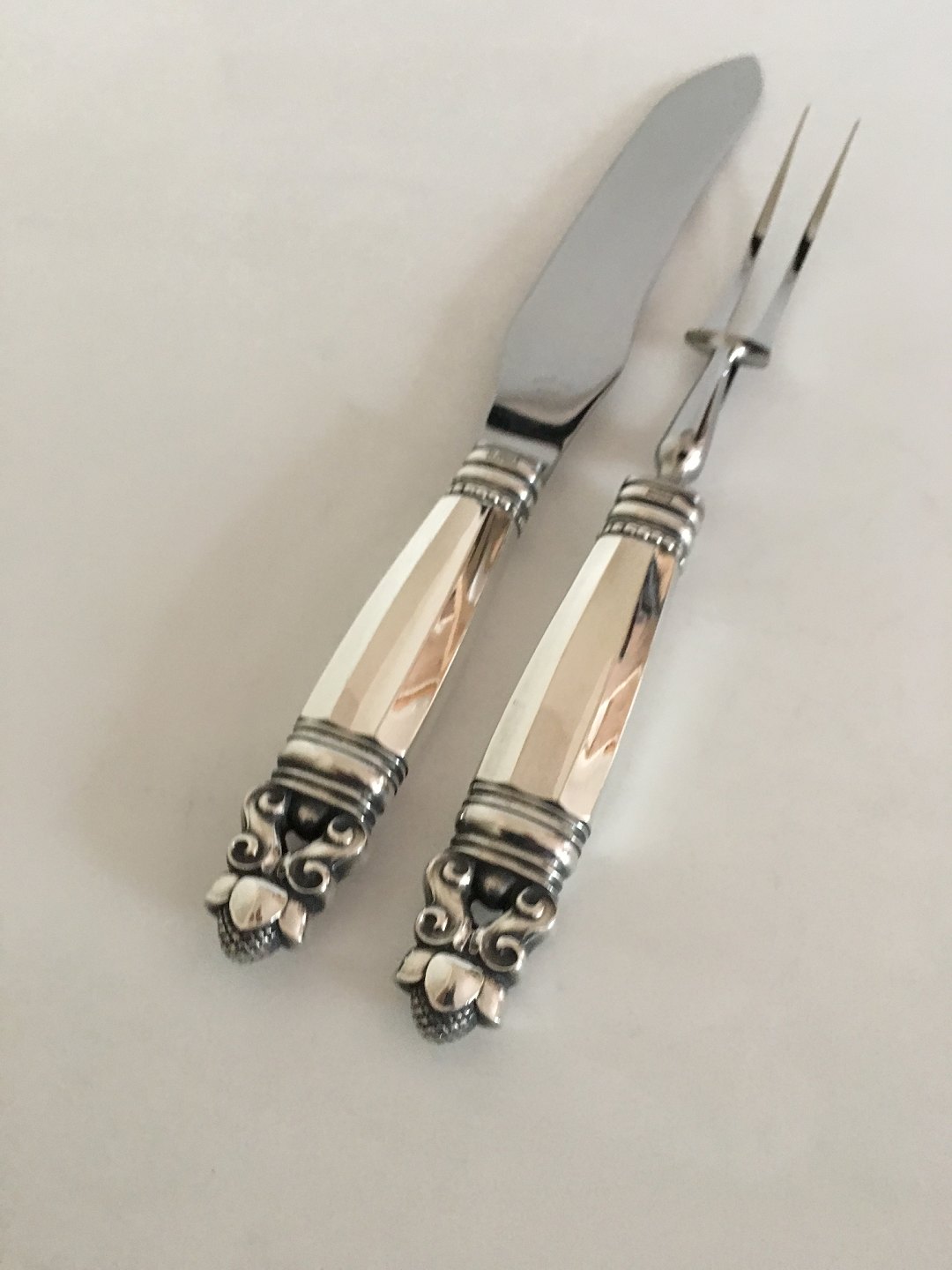 Georg Jensen Konge Sterling Sølv Forskærersæt med kniv og gaffel No. 377. 1945-1951. Måler 32 cm og 27,3 cm.