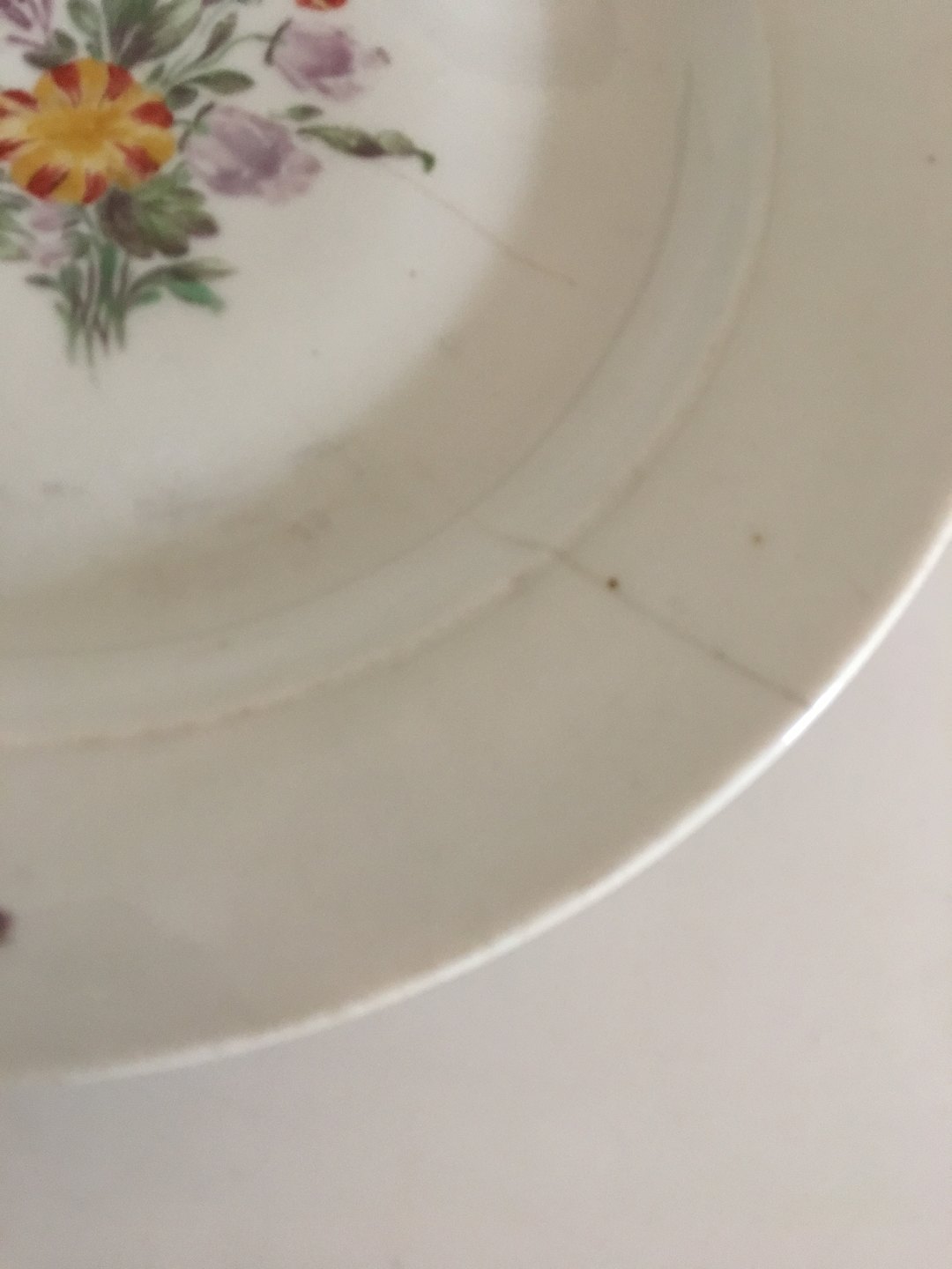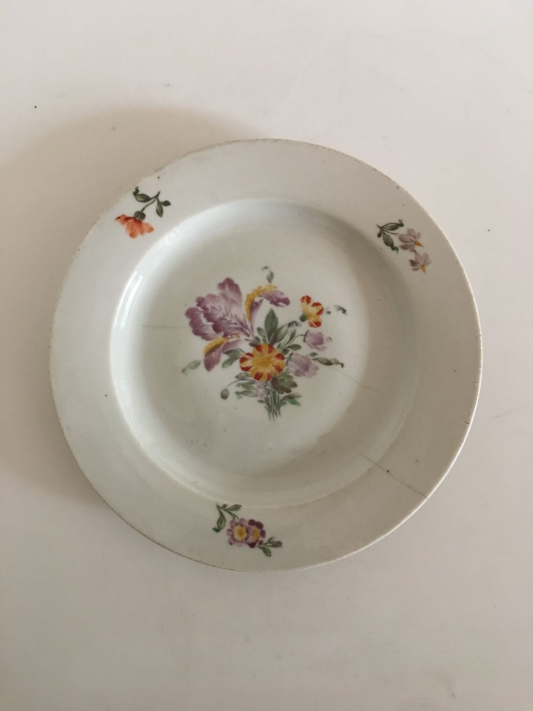 Antik Royal Copenhagen Tallerken med Blomsterdekoration 1790-1810. Porcelænet er en del slidt. Ligesom blomstermotivet er en del falmet. Har to kraftige hårstrejf på tværs af tallerknen. Måler 24.5 cm