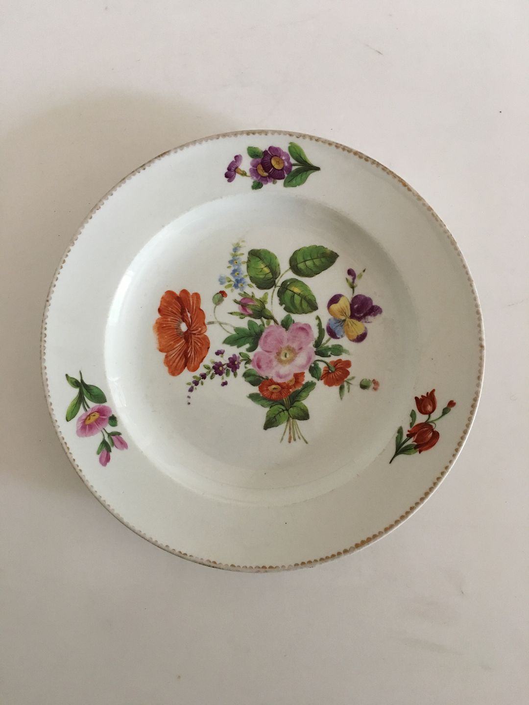 Meissen Spisetallerken med Blomsterdekoration. 23.5 cm dia. Tallerkenen er uden skår, men har noget slid på blomsterdekorationen, samt det meste af den originale guldkant som mere eller mindre er slidt helt af.