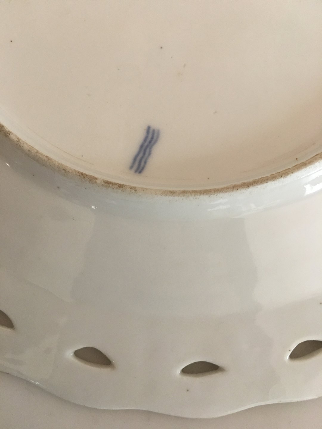 Royal Copenhagen Antik Fuld Saksisk Blomst Frugt Tallerken med Gennembrudt Blondekant. I hel stand, med lidt guldslid. 23 cm dia. fra omkring 1800