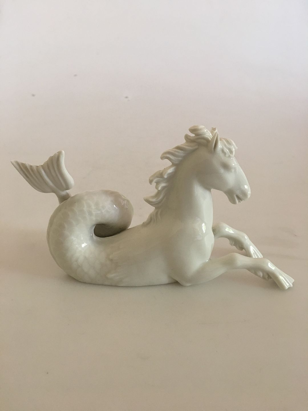 Royal Copenhagen Bordgarniture Havheste Figur i Blanc de Chine. Har et afslag på den ene ørespids, eller i pæn stand. 19 cm L. 9 cm H.