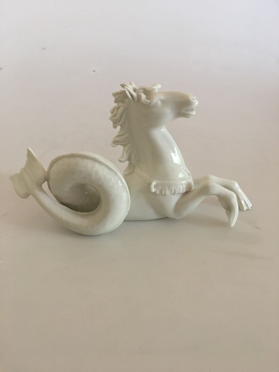 Royal Copenhagen Bordgarniture Havheste Figur i Blanc de Chine. Har et afslag på ringen i dens seletøj, ellers i pæn stand. 19 cm L. 9 cm H.