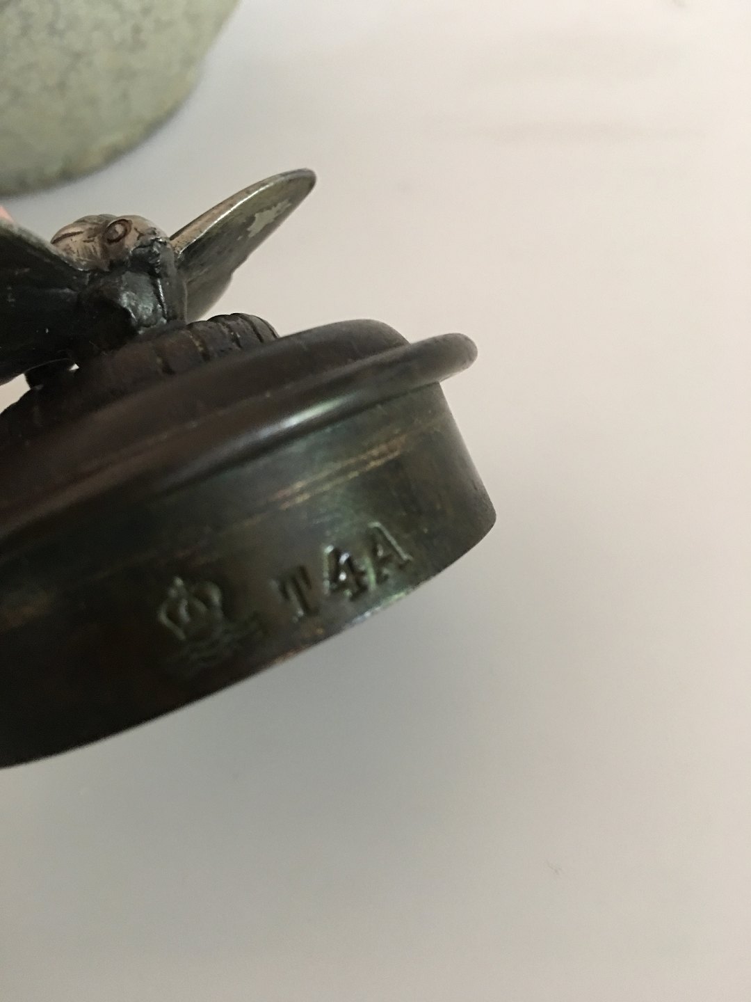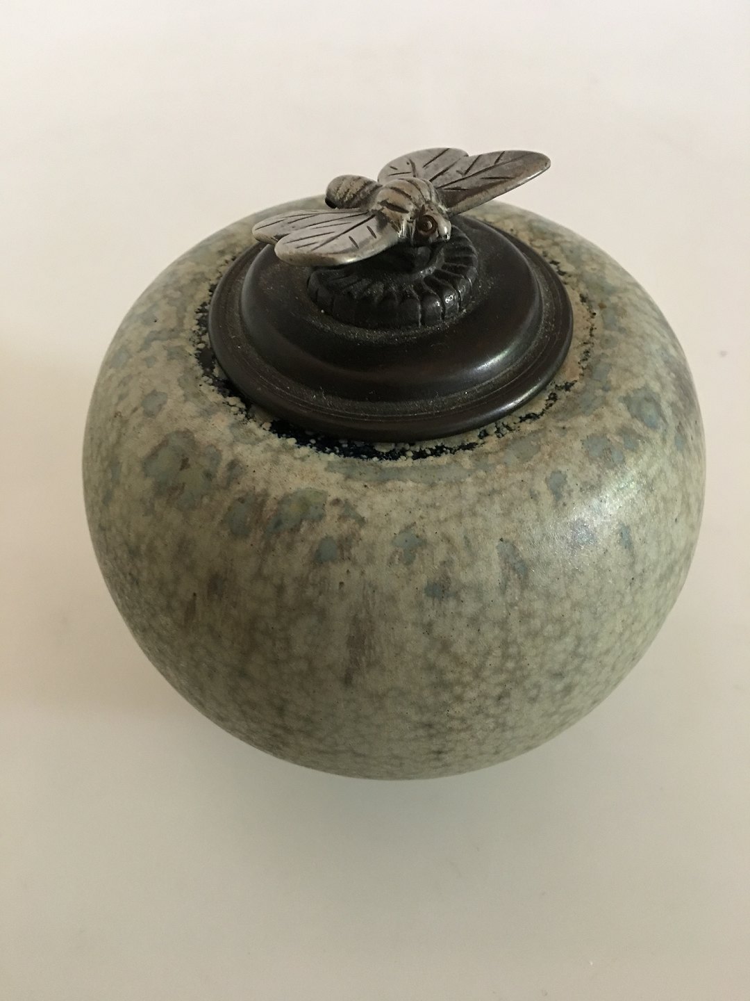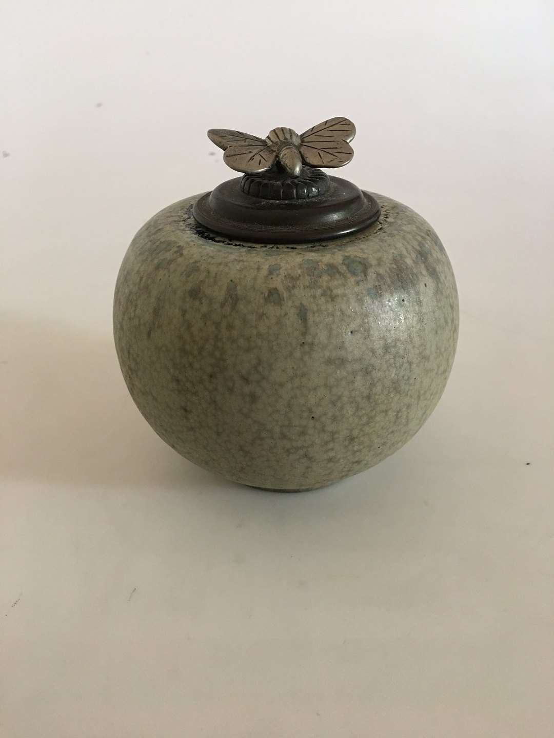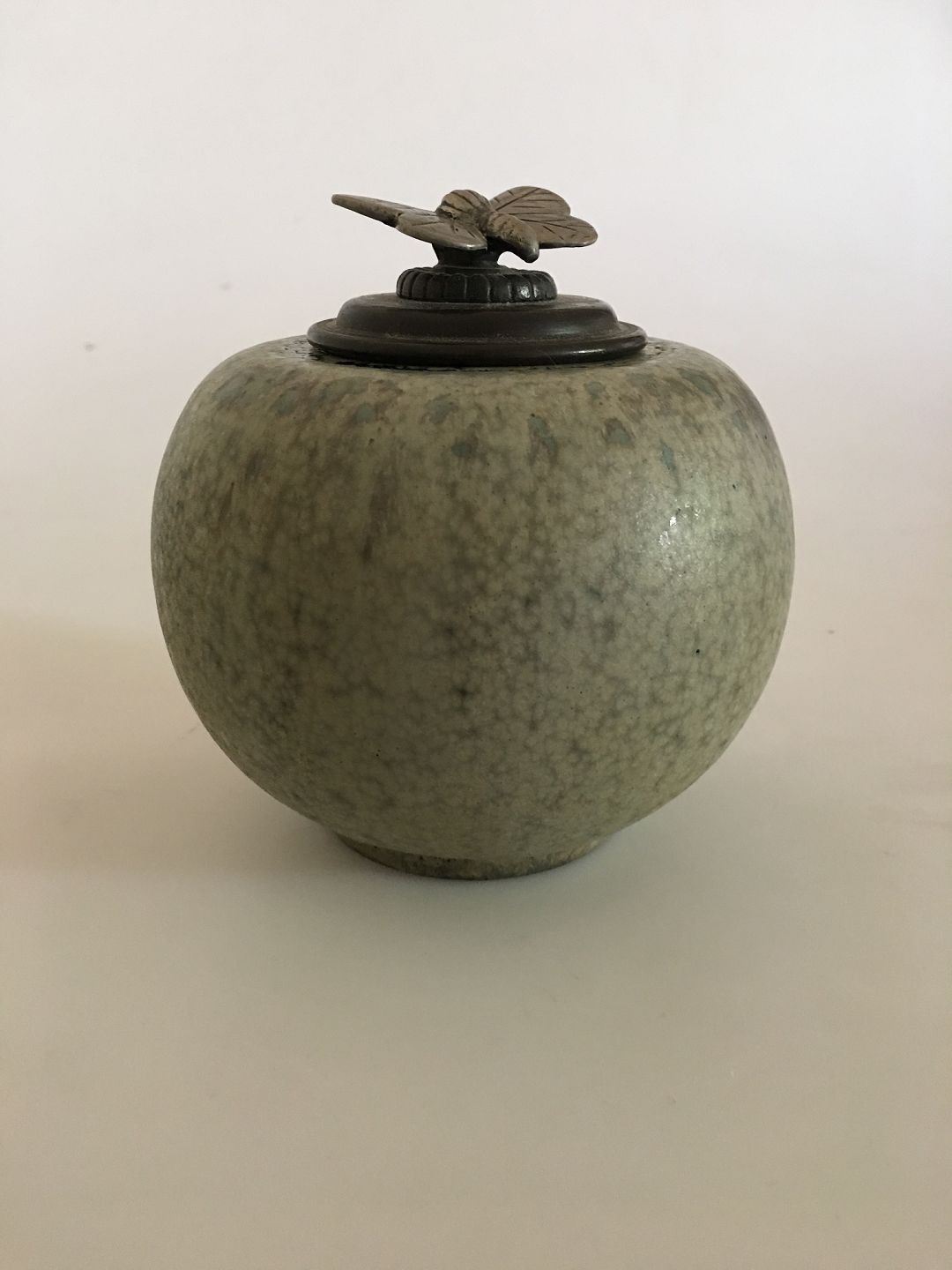 Royal Copenhagen Stentøjsvase Vase / Vessel i Fugleæg Glasur med Bronze Låg No 47/4A. Vasen er mærket 47/4A og Låget med T4A. I fin hel stand. Bronze låg med Flue i Tin. Måler ca. 9 cm høj uden låg. Låget af Georg Thylstrup
