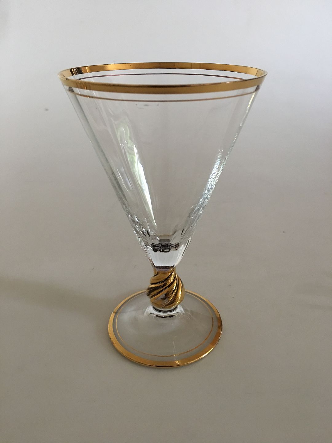 Holmegaard Ida rødvinsglas med guld på stilk, rand og fod. Måler 14,5 cm Høj. 9,3 cm. diameter.