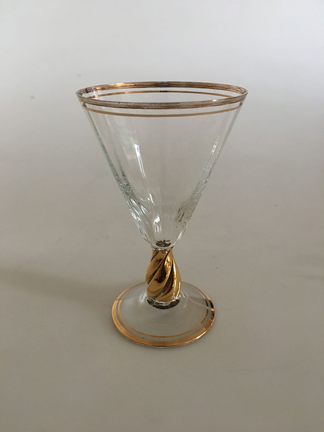 Holmegaard "Ida" hedvinsglas med guld på stilk, rand og fod. Måler 10,4 cm Høj x 6,5 cm diameter.