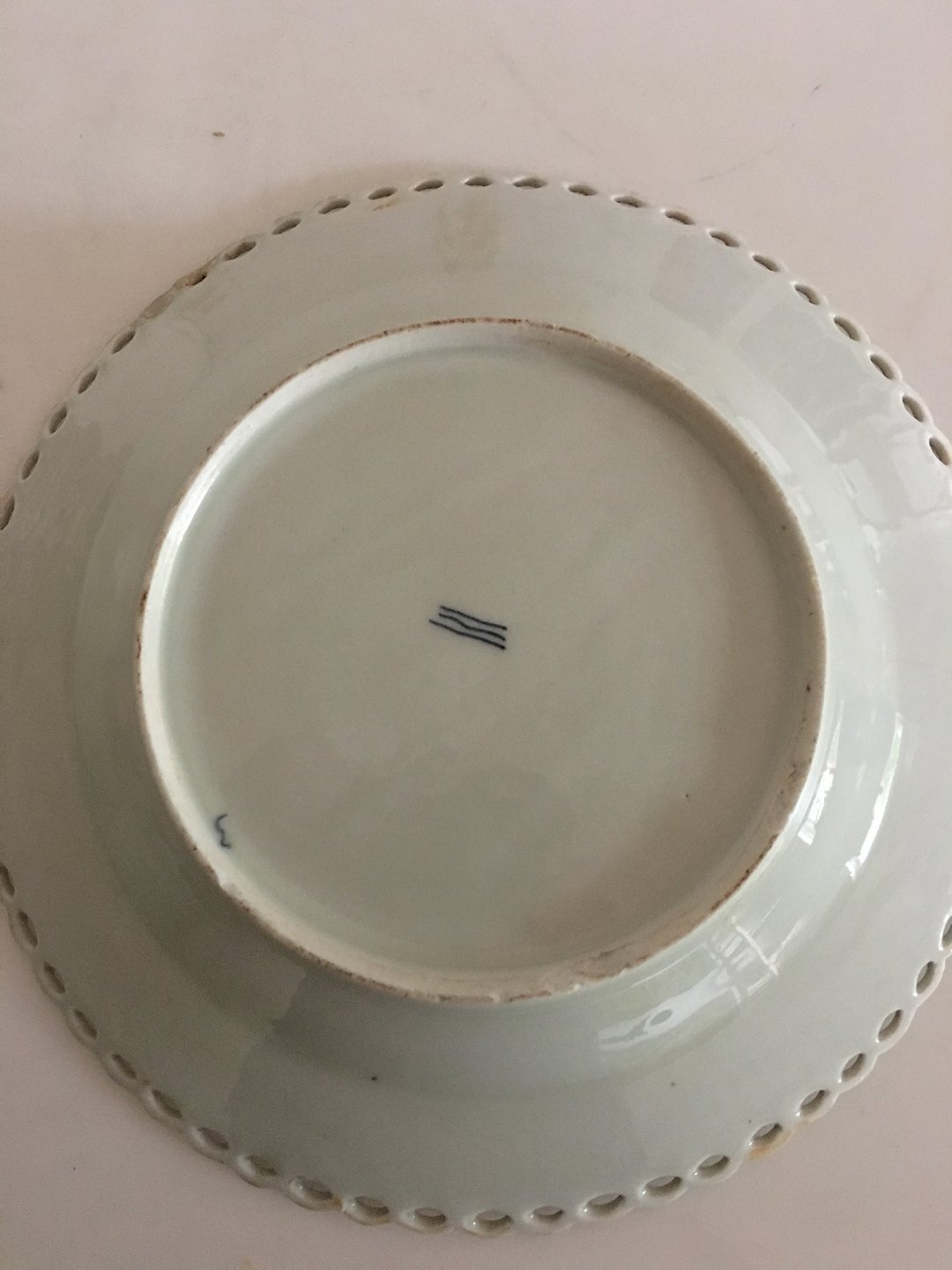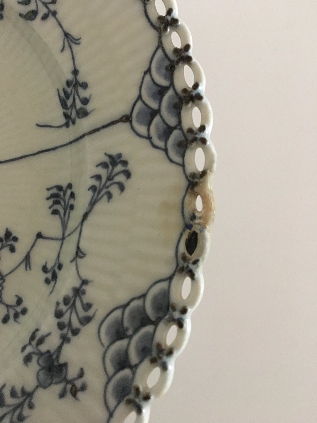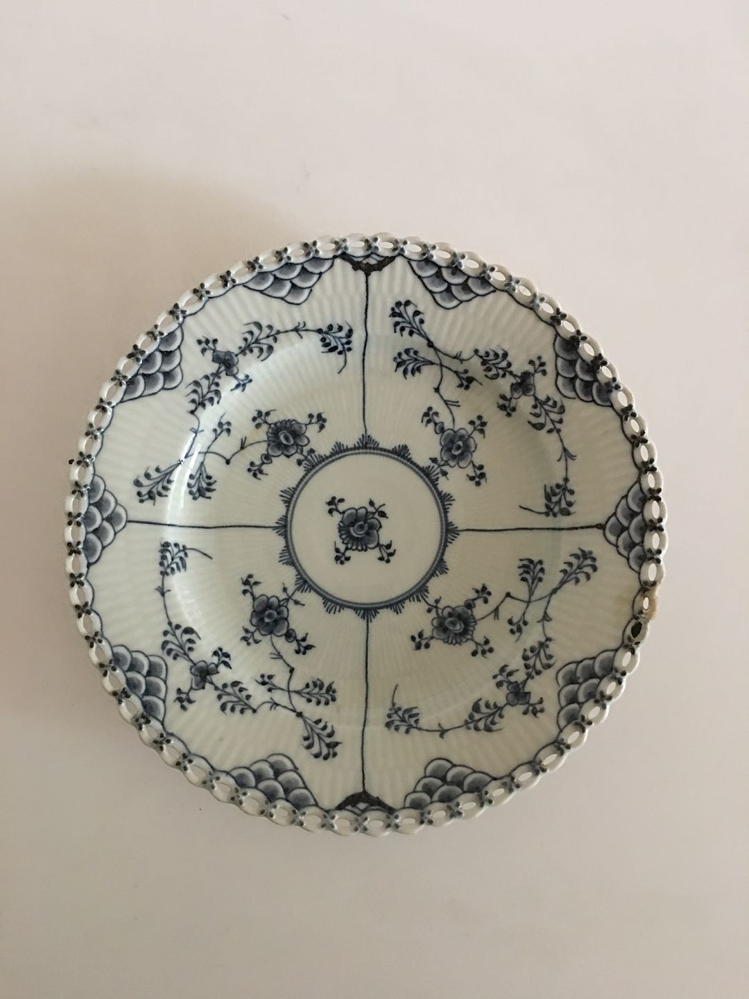 Royal Copenhagen Antique Blue Fluted Full Lace Plate. 23.5 cm dia. The plate is chipped and repaired on one place on the laced rim. Has another couple of chips underneath. Greyish in the porcelain color.