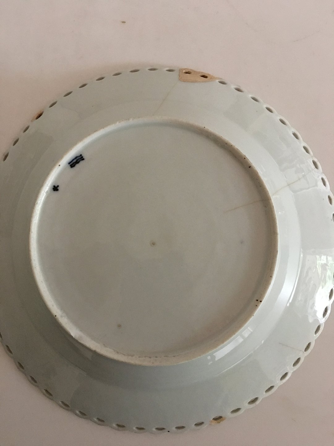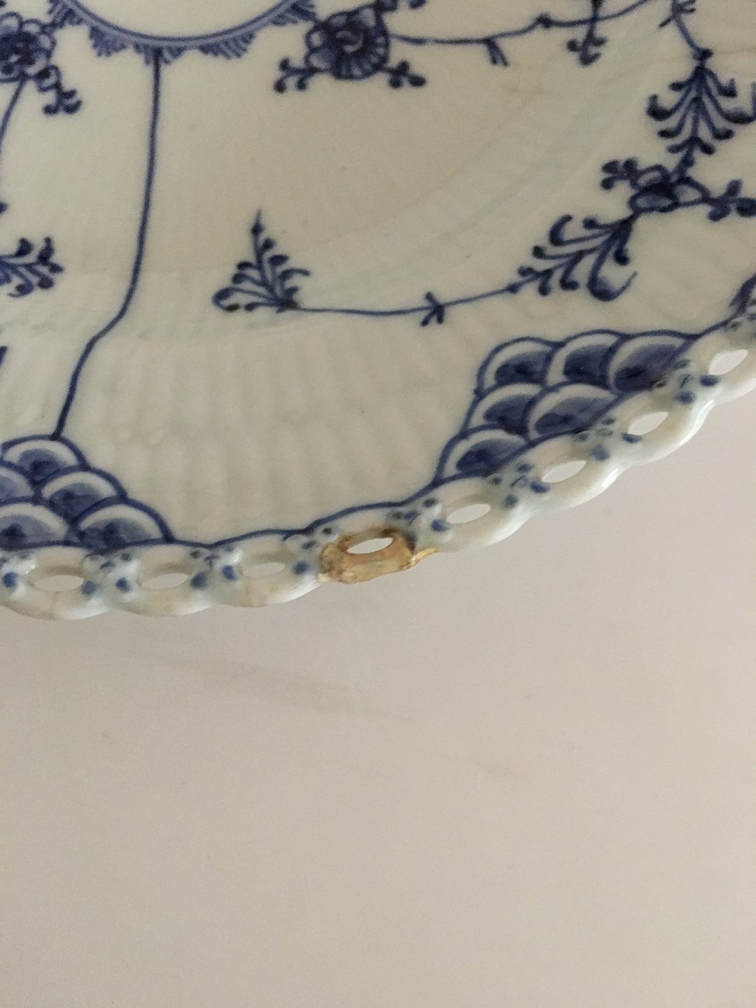Royal Copenhagen Antik Musselmalet Helblonde Tallerken. Måler 23,5 cm dia. / 9 1/4 in. Skåret og limet to steder på blondekanten. Har desuden et par hårrevner.