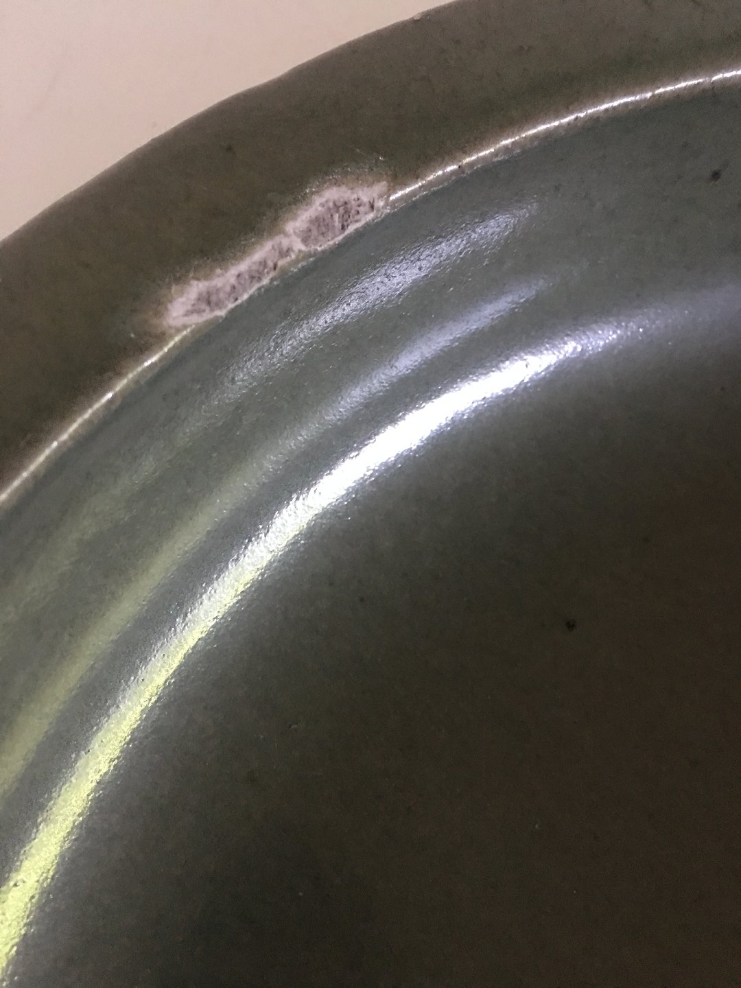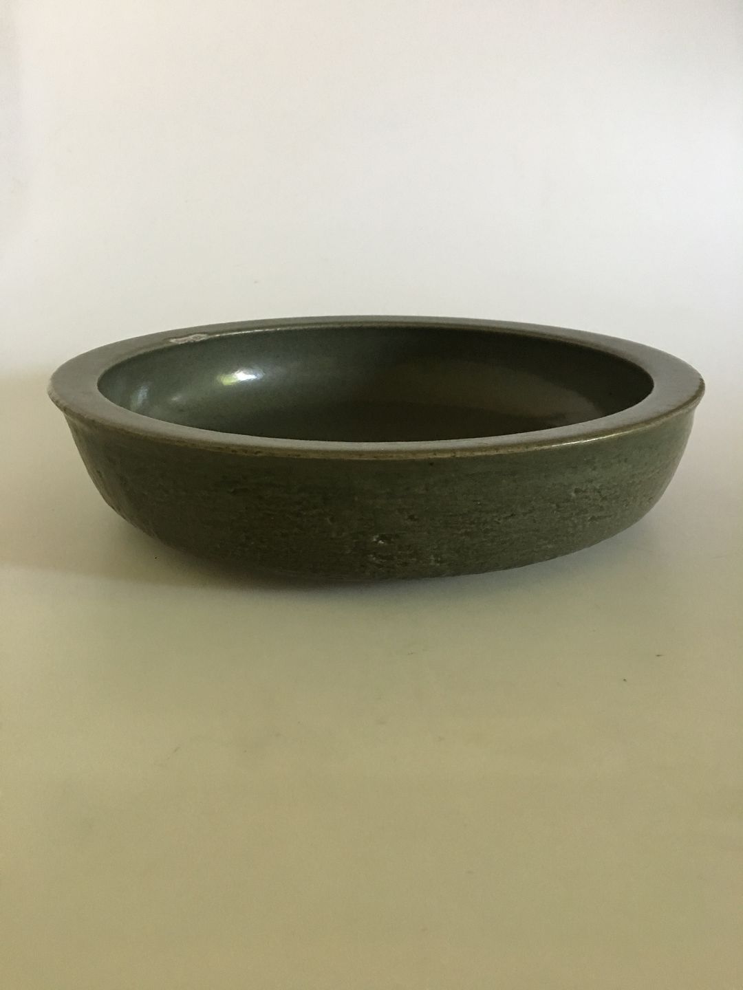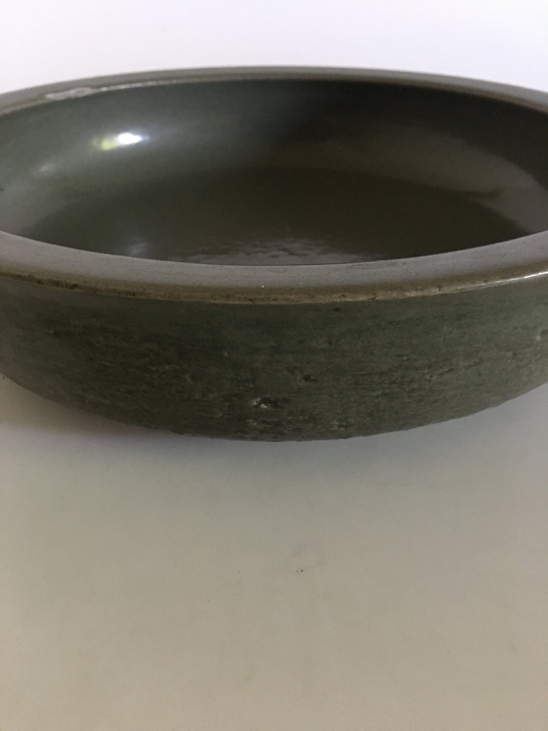 Royal Copenhagen Alev Siesbye Keramik Skål . Olivengrøn 33 cm diameter. 7.5 cm høj. Skålen har desværre fået et slag på kanten (se billede).