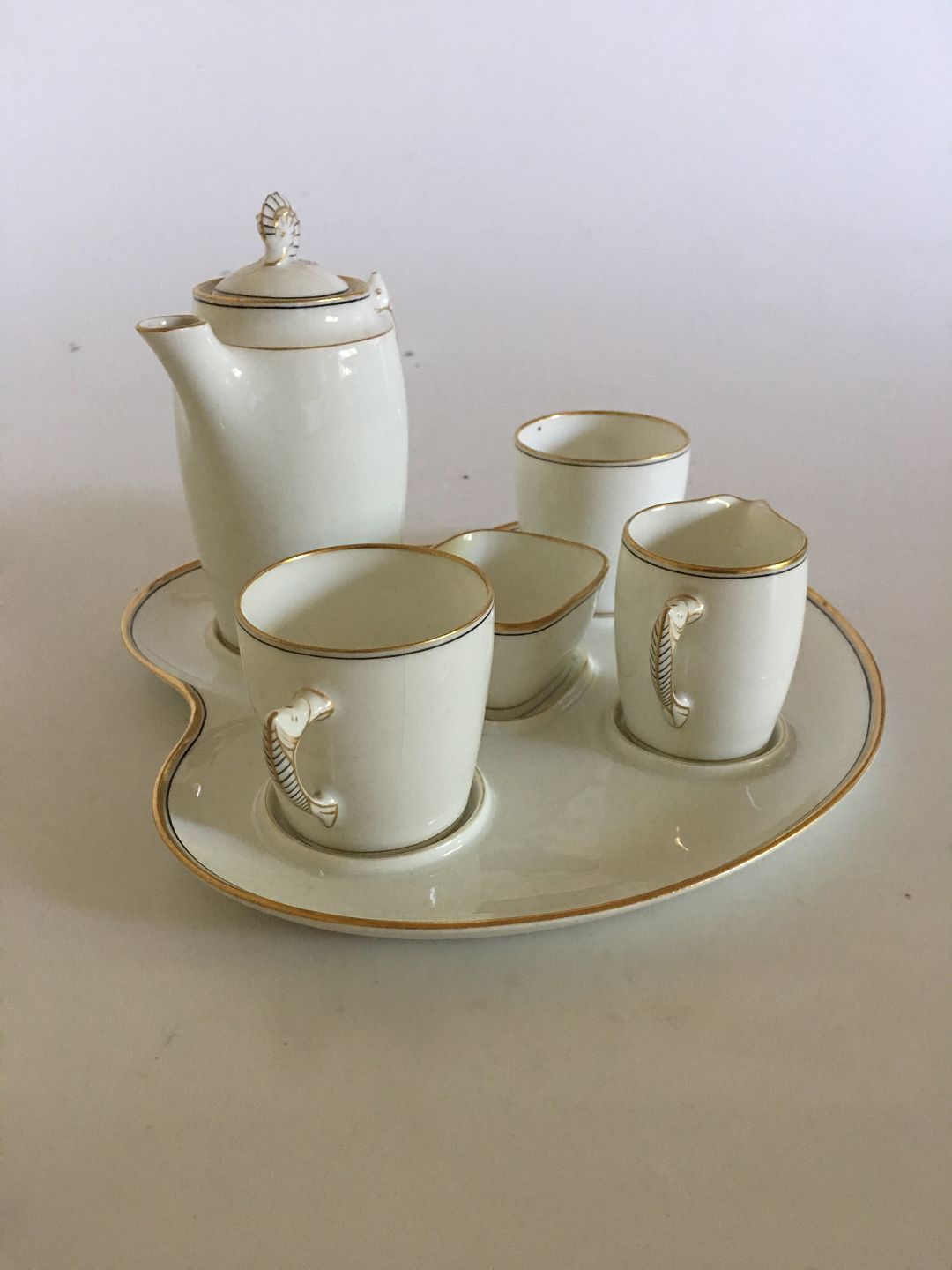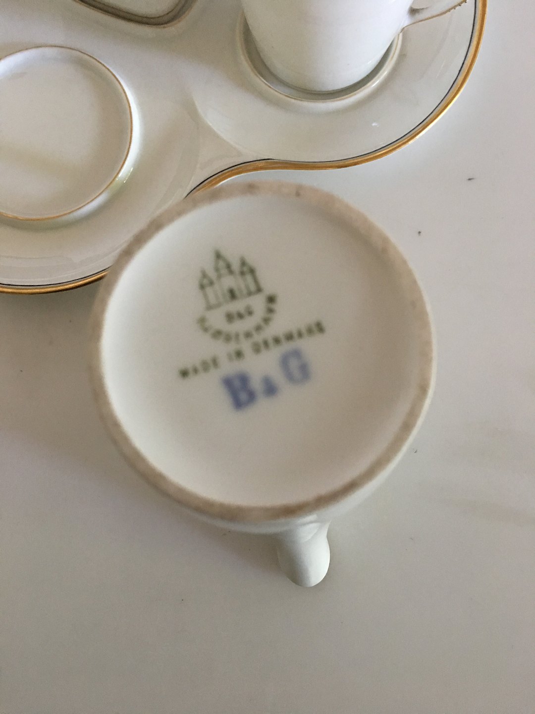 Bing & Grøndahl Mokkasæt m. Kande, To Kopper, Flødekande og sukkerskål. I fin stand, med minimal guldslid. Kun den ene kop har et lille afslag. Mokkakanden måler 12 cm Høj.