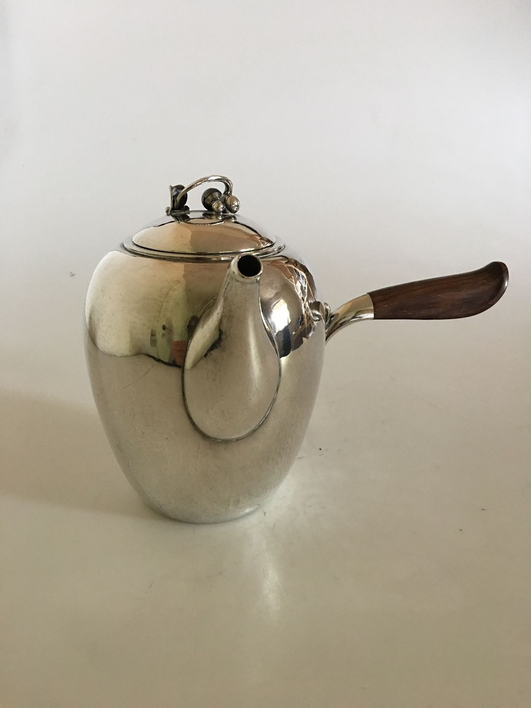 Georg Jensen Sterling Sølv Kaffekande No. 875 med Træhåndtag. Designet af Harald Nielsen. Fra 1943 stemplet Georg Jensen & Wendel. 14.5 cm Høj. 1 L. Vejer 505 gram.