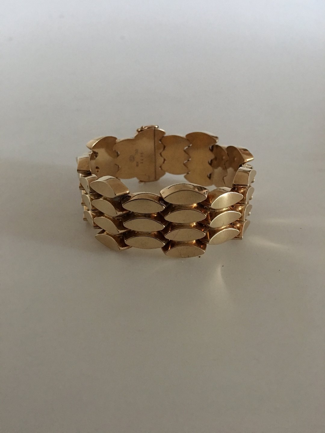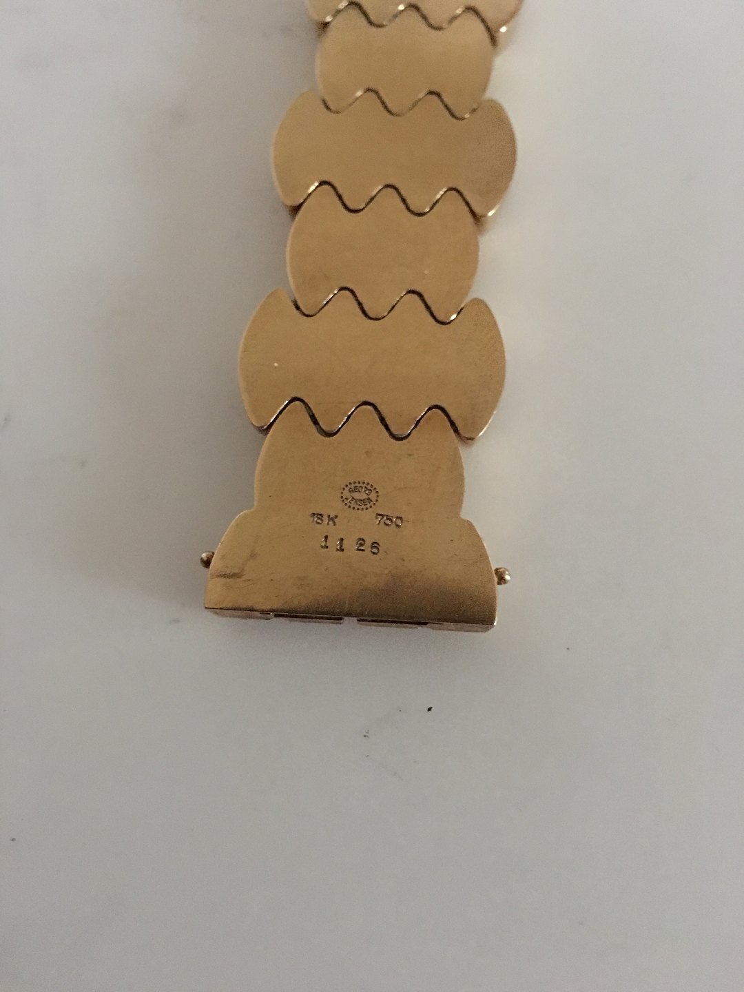 Georg Jensen 18K Gold Bracelet No 1126 designed by Arno Malinowski. Measures 18.5 cm x 2.5 cm wide. Weighs 76 g / 2.70 oz. Manufactured after 1945, in beautiful condition.