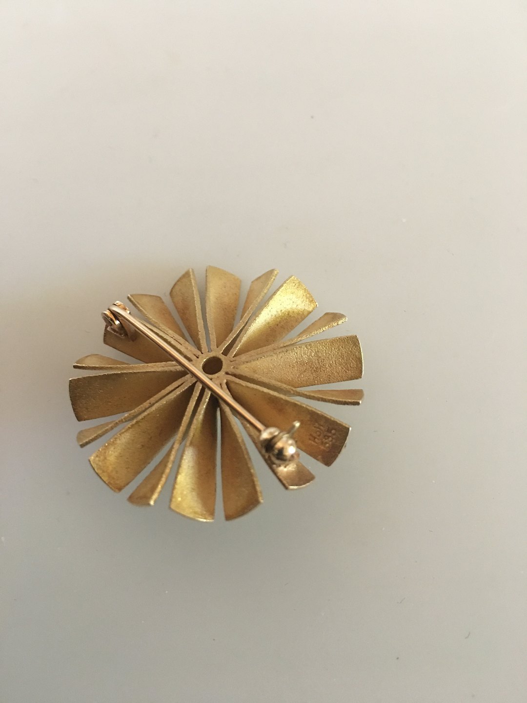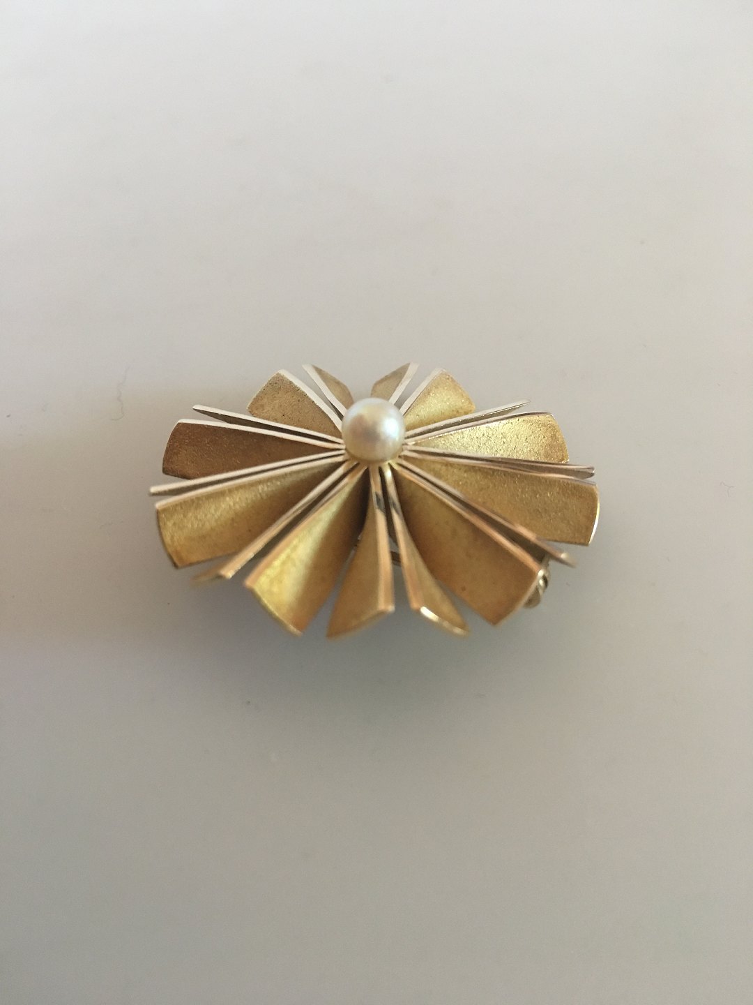 Hans Hansen 14K Guld Rund Broche med Lille Perle. Måler 3.3 cm diameter. Vejer 13 gram.