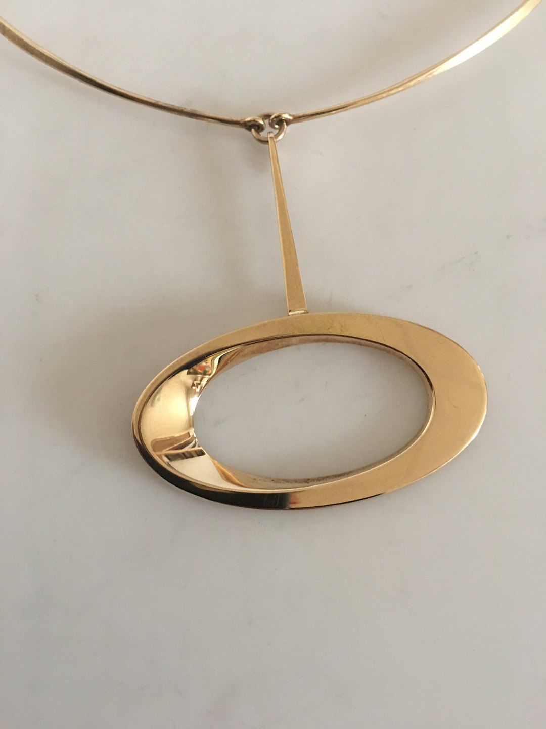 Hans Hansen 14K Guld Vedhæng No 103 i Halsring af 14K Guld (Ikke stemplet Hans Hansen). Diameter på halsringen måler 12 cm. Oval diameter på vedhæng måler 5,5 cm. Vejer 25 g.