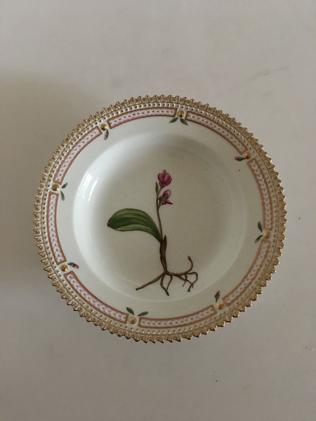 Royal Copenhagen Flora Danica Small Deep Plate No. 3590. Latin Name: Plathanthera Rotundifolia Lindl. 14.5 cm (5 45/64"). In perfect condition.