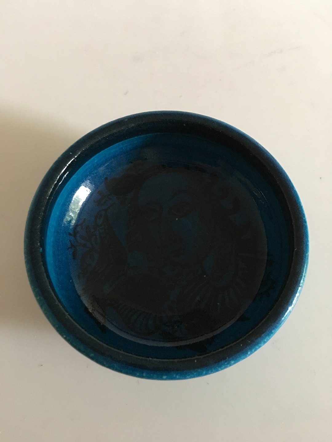 Royal Copenhagen Unika Stentøjsskål med Blå Glasur af Nils Thorsson. Kvindeportræt i bunden af skolen. 5.5 cm H. 13 cm diameter. I fin stand.