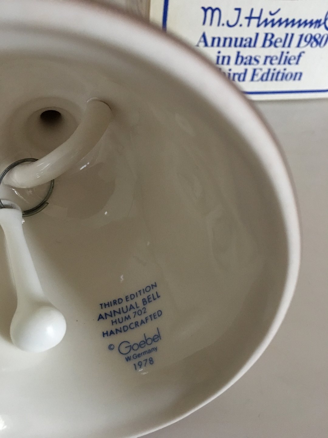 Hummel Årsklokke 1980 med bas-relief motiv. 3 udg. 1978-1992. Goebel Porcelæn Tyskland. 15 cm H. 10 cm Ø.