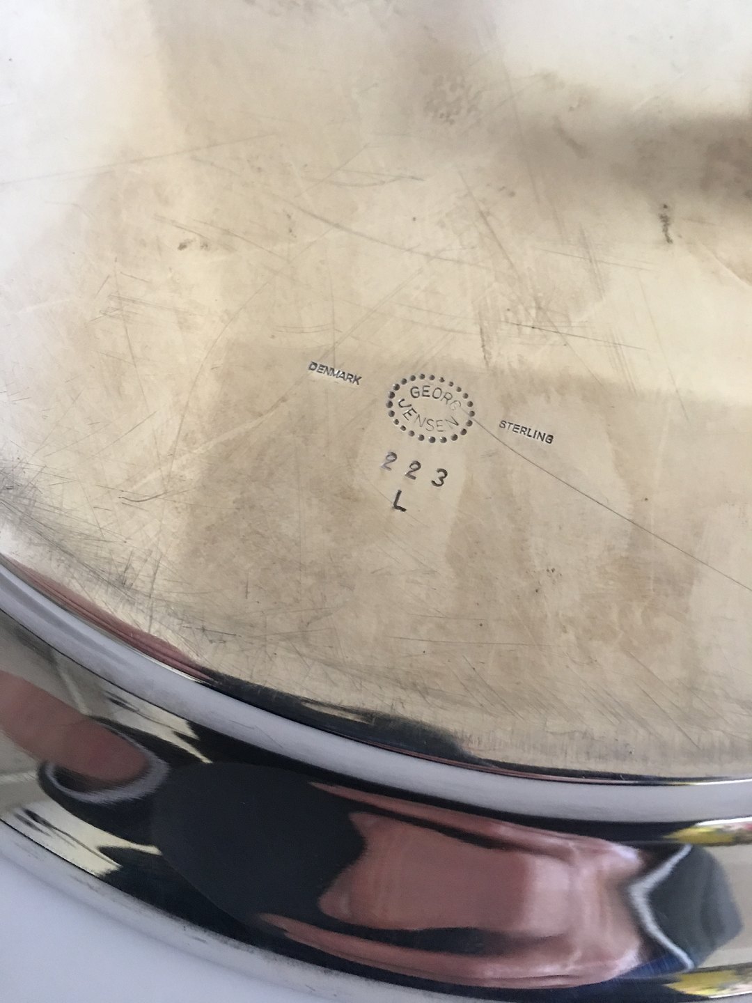 Georg Jensen Sterling Silver Oval Tray No. 223 L. Measures 44 x 31.5 cm (17 21/64" x 12 13/32"). Weighs 1150 grams. Manufactured after 1945. In good condition.
