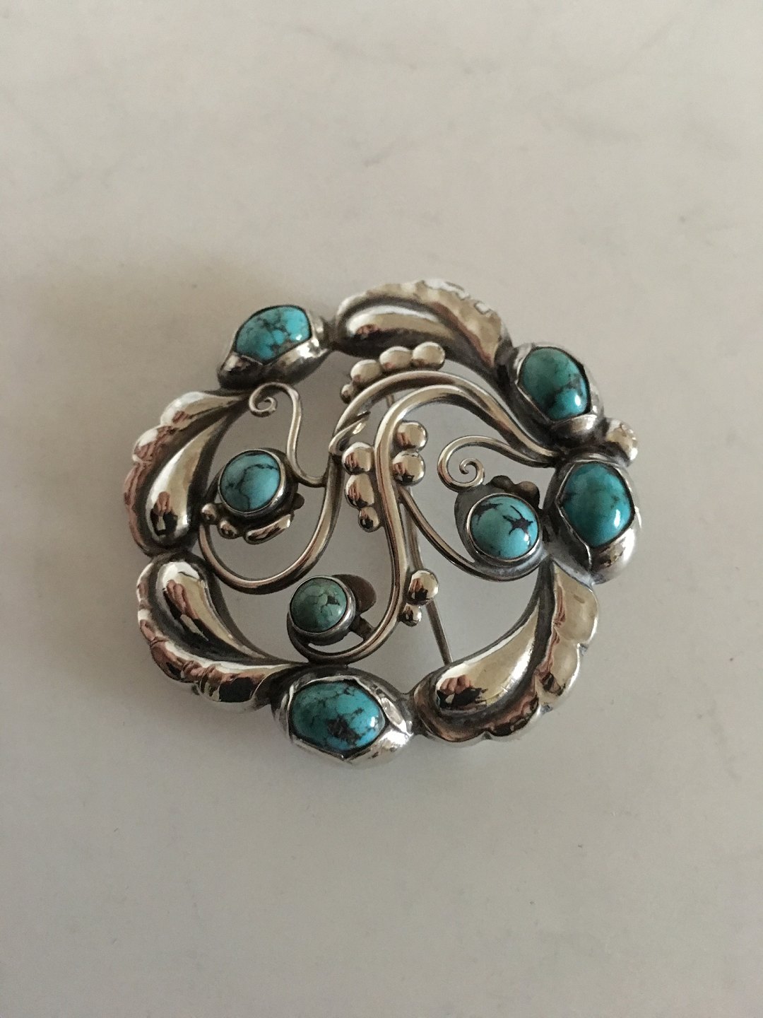 Georg Jensen Sterling Sølv Broche No 159 Prydet med Turkiser. Måler 4,6 cm Ø. Vejer 17 gram. Produceret efter 1945.