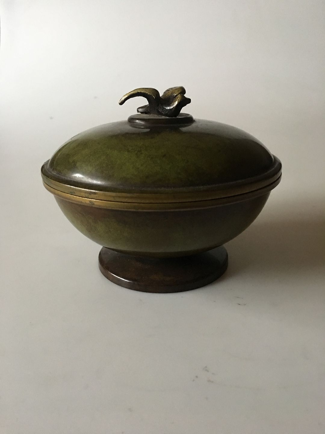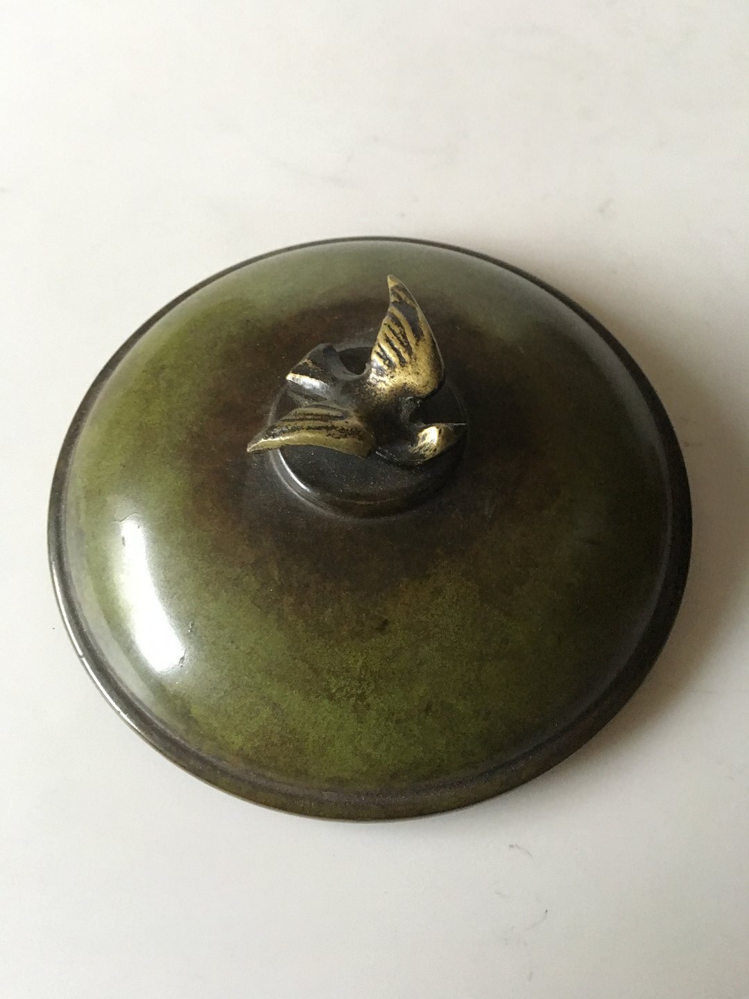 Ægte Ildfast Bronze Skål med Låg pyntet med en Lille Fugl. Måler 13 cm diameter. I pæn stand.