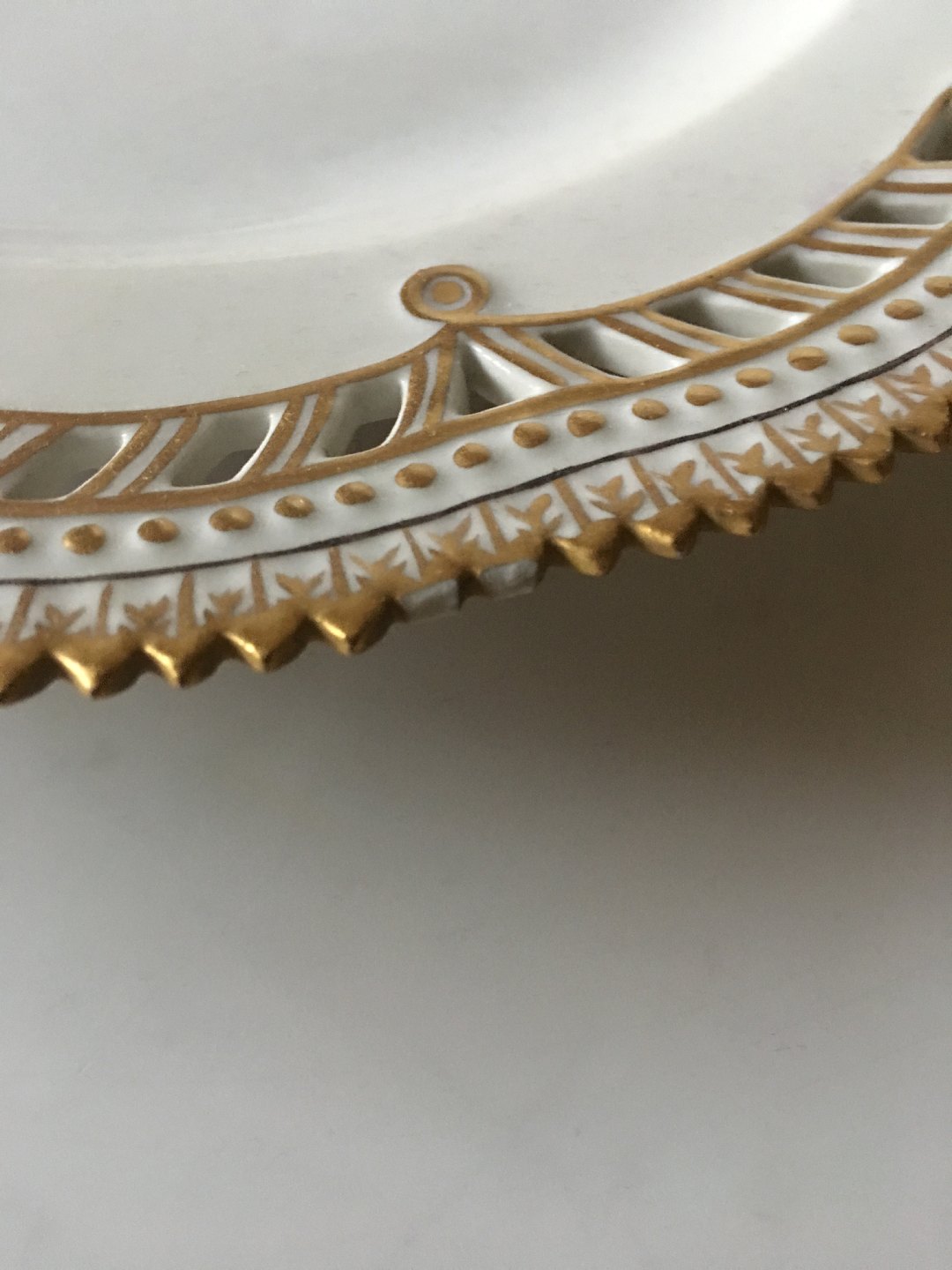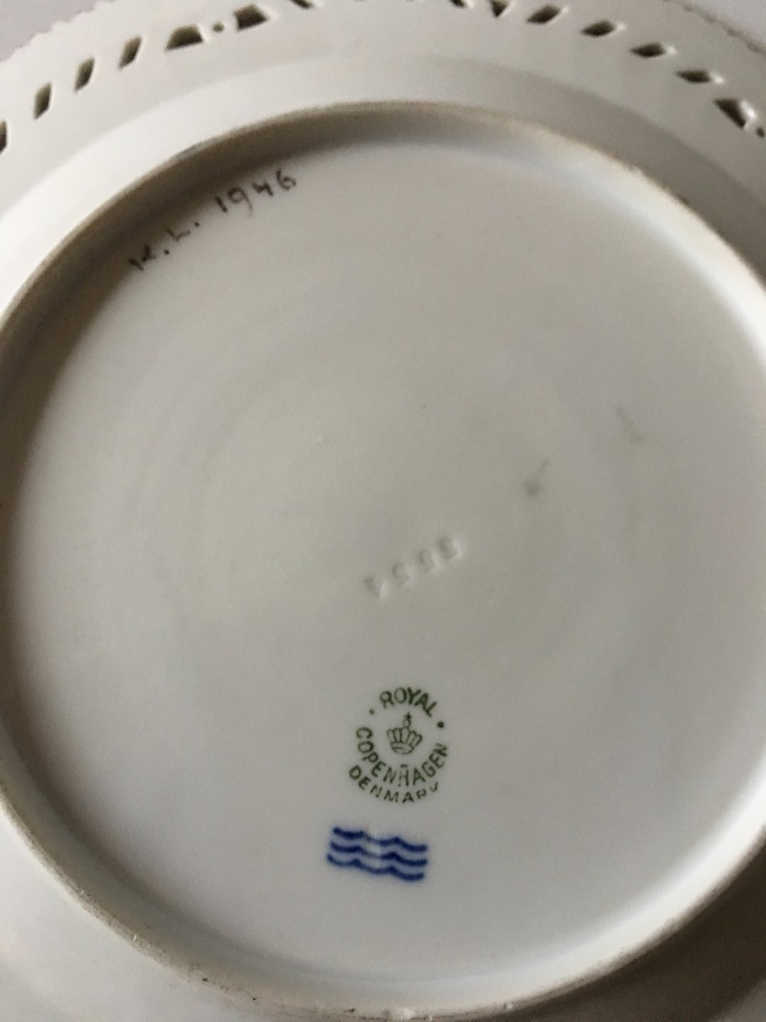 Royal Copenhagen Flora Danica Tallerken med Gennembrudt Kant og Monogram. 2. Sortering, et skår på kanten. Måler 23 cm diameter.
