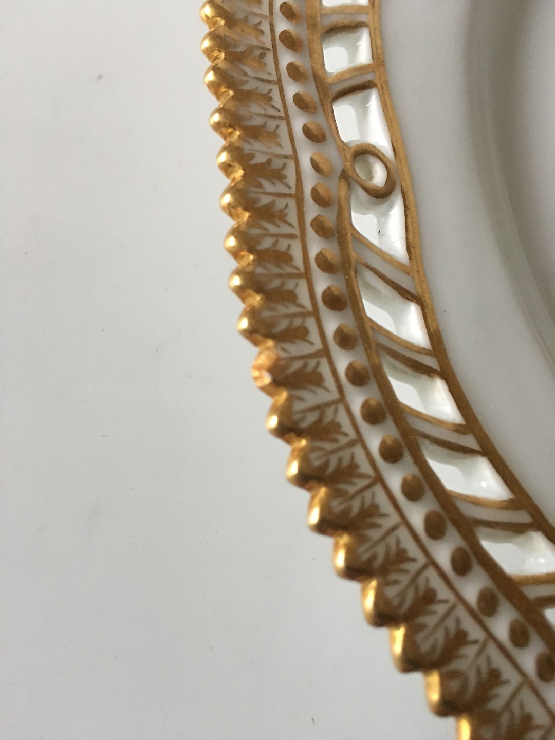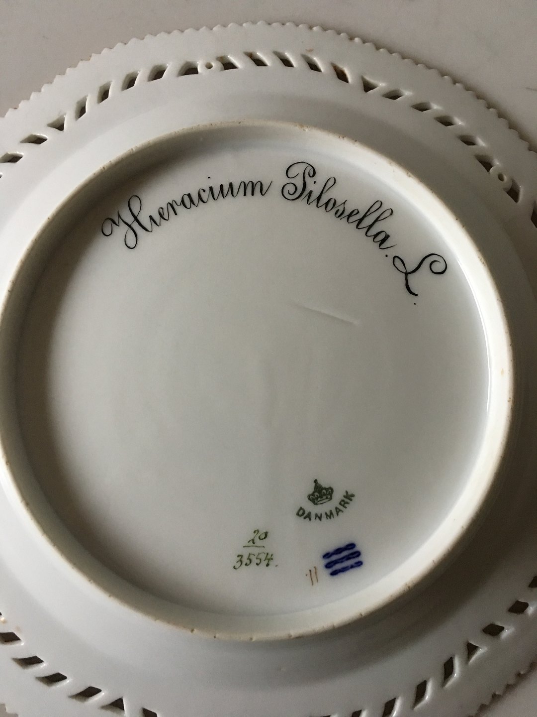 Royal Copenhagen Flora Danica Luncheon Plate with Pierced Border No. 20/3554. The plate has a small chip on the bord not easy to see at is has been repainted with gold. Measures 22.5 cm diameter (8 55/64").