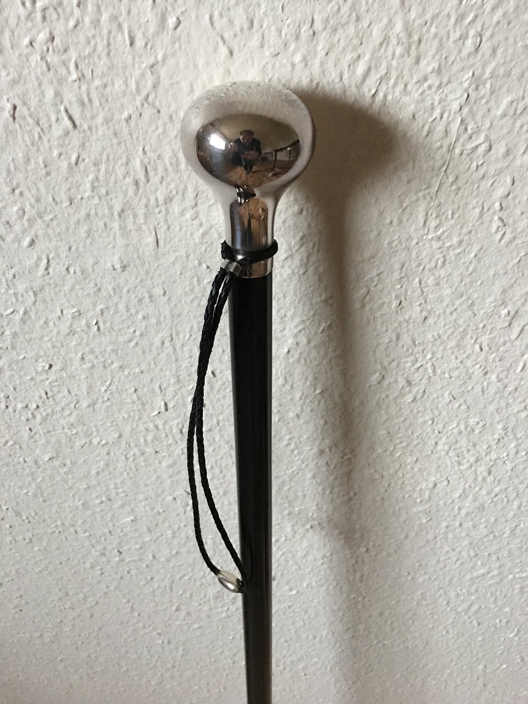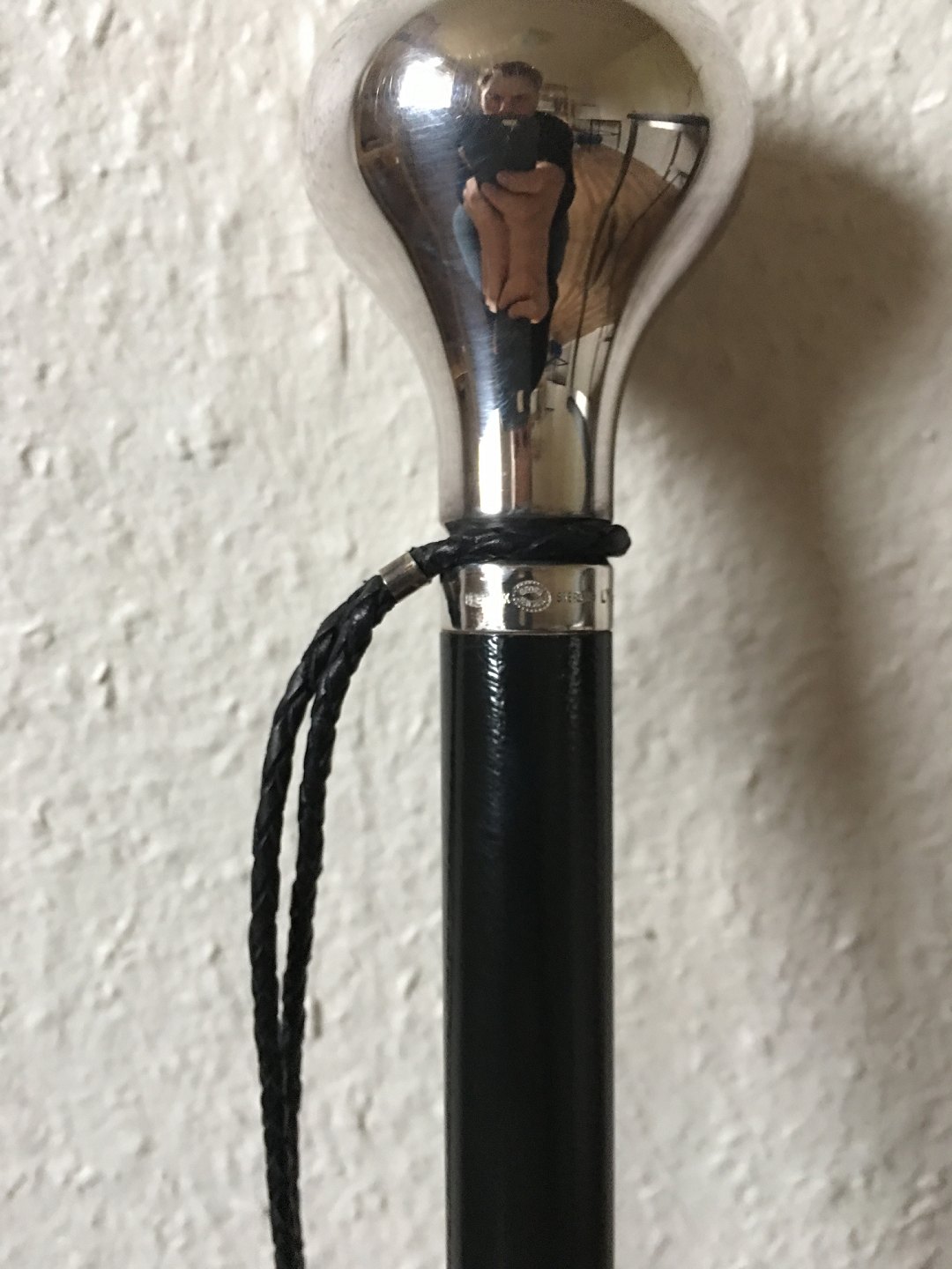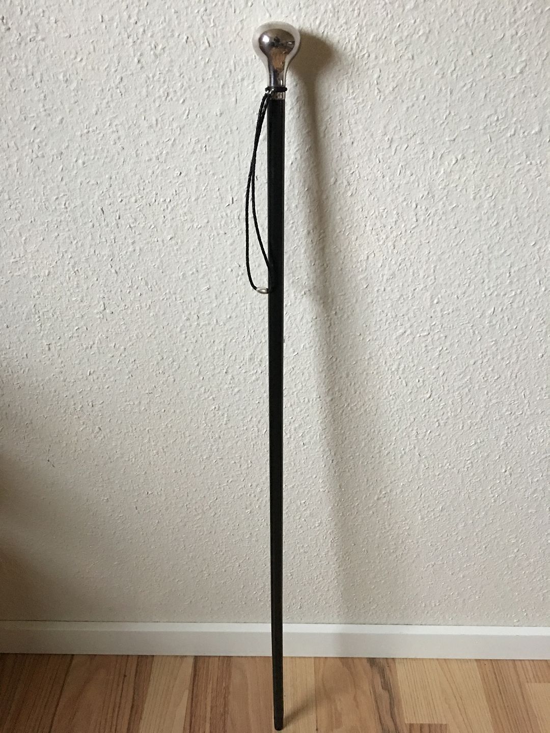 Georg Jensen Walking Stick in Black Lacquered Wood with Sterling Silver Knop and Leather Wristband. Measures 110 cm L. Manufactured after 1945 and in great condition.