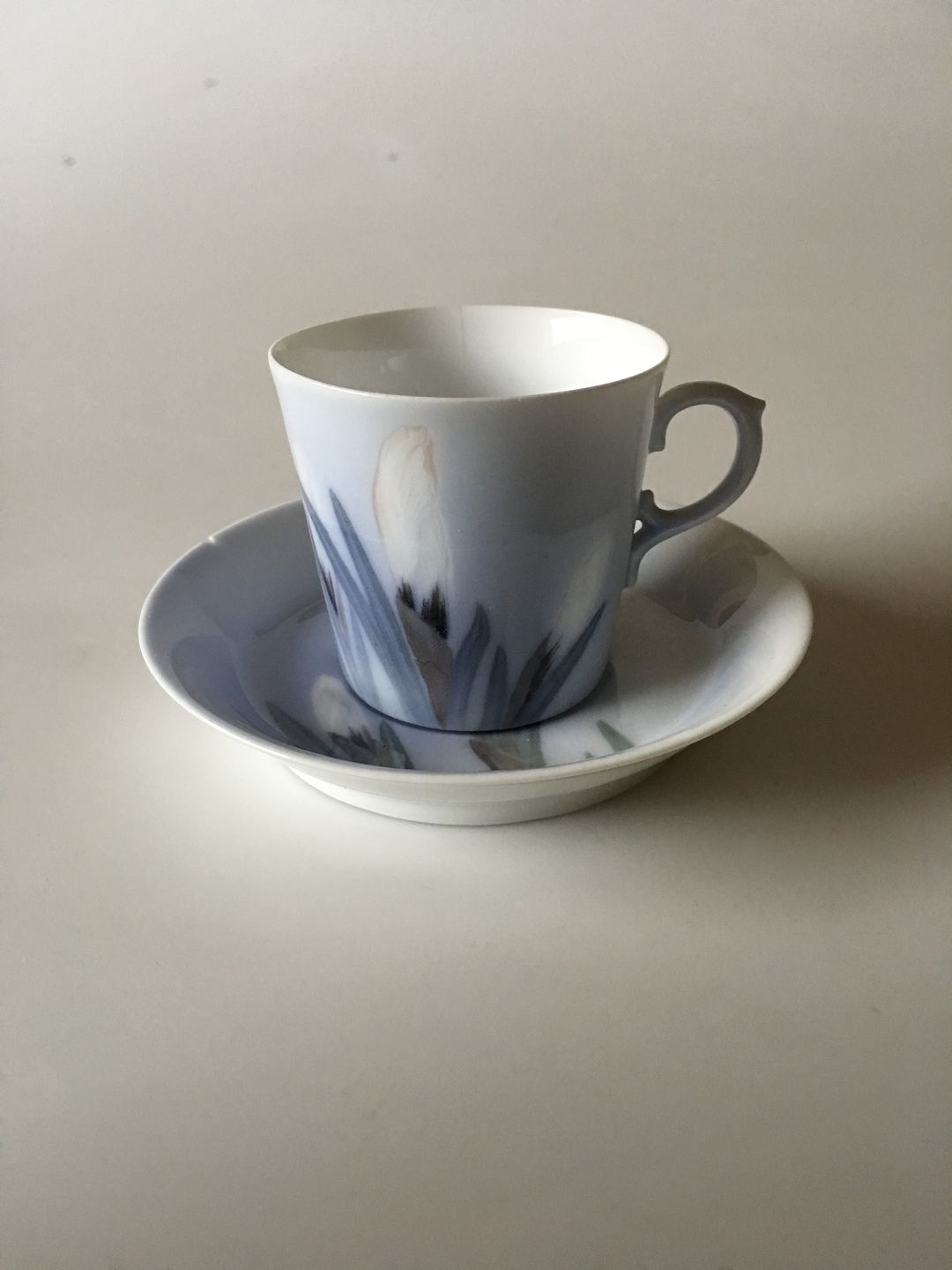 Royal Copenhagen Art Nouveau Mokka Kop og Underkop. Koppen har et par hårrevner og underkoppen har et skår. Kop måler 5.2 cm H. 5.8 cm diameter. Unika signeret af Oluf Jensen
