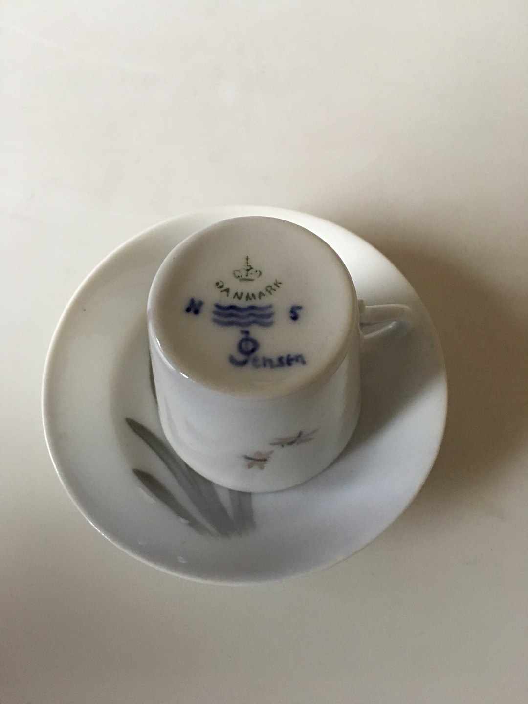 Royal Copenhagen Art Nouveau Mocha Cup and Saucer. The Cup has a hairline crack, the saucer in fine condition. The cup measures 5.2 cm H and 5.8 cm diameter. Unique signed by Oluf Jensen
