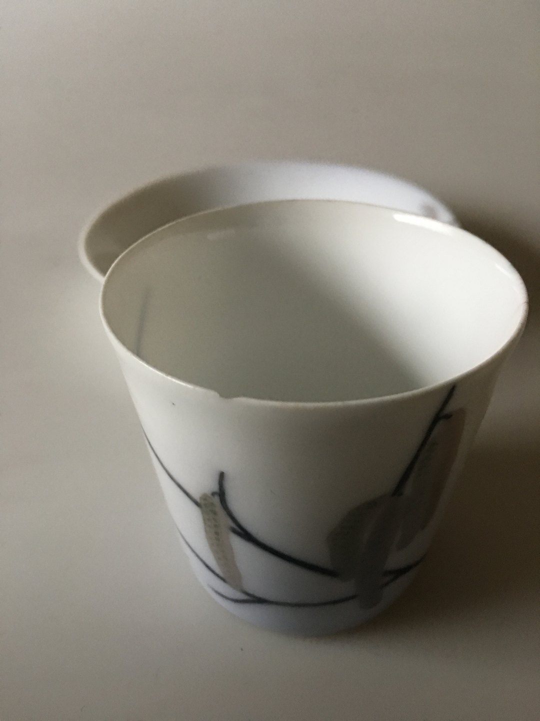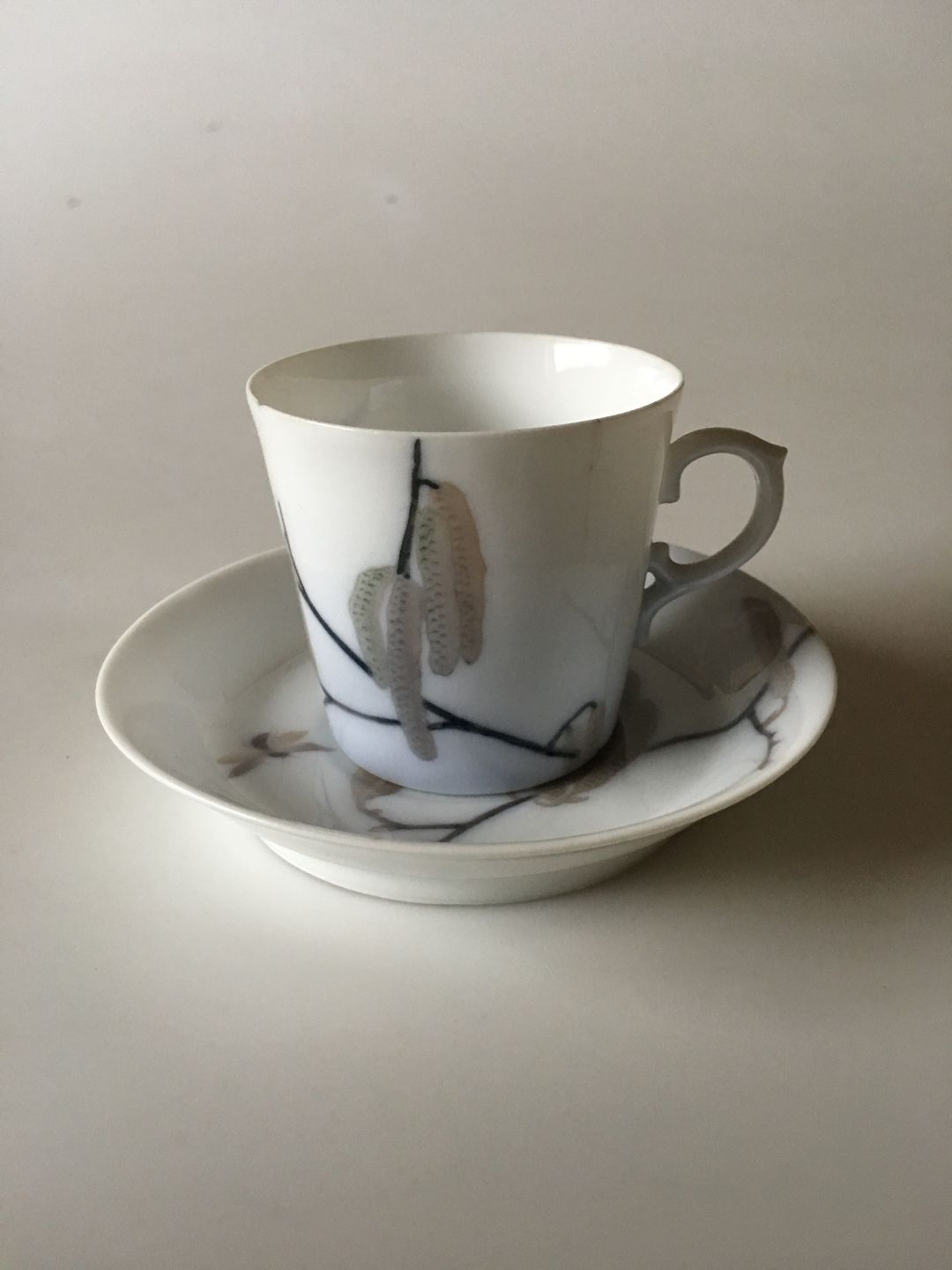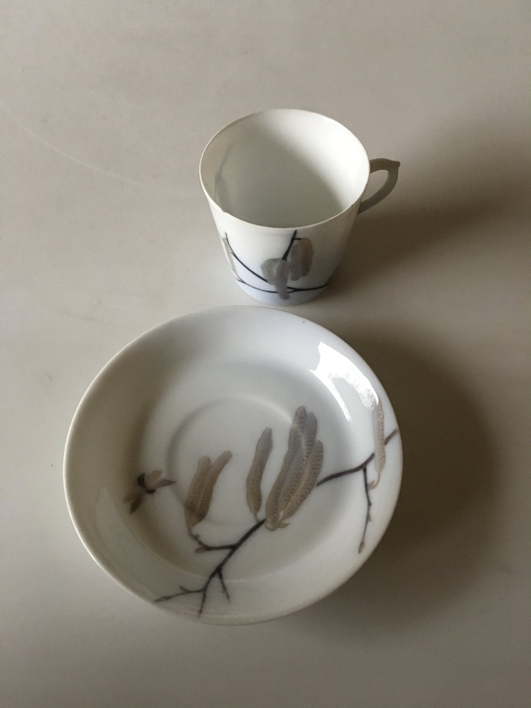 Royal Copenhagen Art Nouveau Mokka Kop og Underkop. Koppen har en hårrevne og et lille skår på kanten, underkop i fin hel stand. Måler 5.2 cm H. 5.8 cm dia. Unika signeret af Oluf Jensen