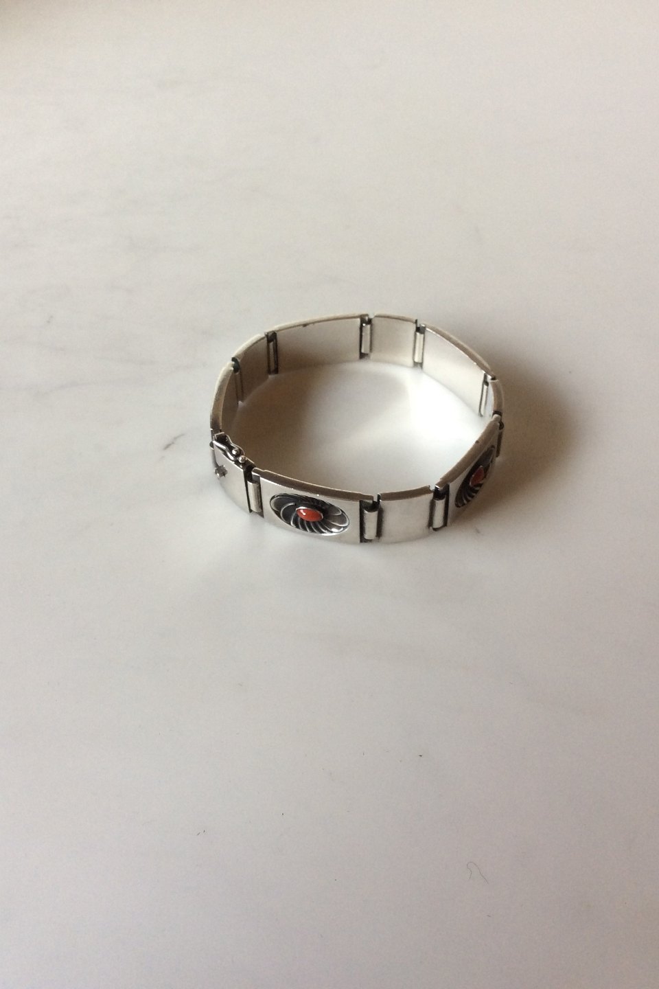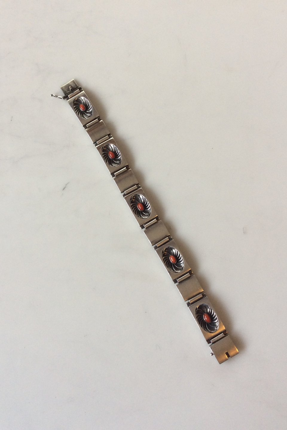 Georg Jensen Sterling Sølv Armbånd No 56A. Med cabochonslebne røde koraller. Designet af Henry Pilstrup, 1933-44. Måler 19 cm. Vejer 49 g.