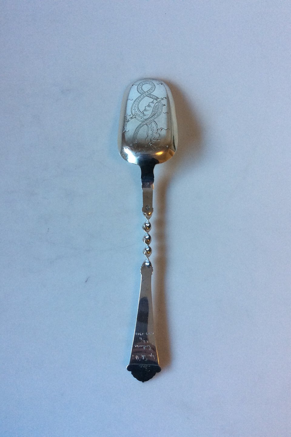 Jordbærske i tre-tårnet sølv og forgyldt skeblad. Mesterstempel P.O. Måler 27,5. cm. Vejer 86 g. Indgravering og drage på bagsiden
