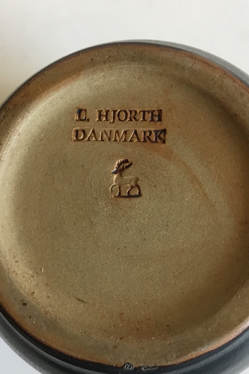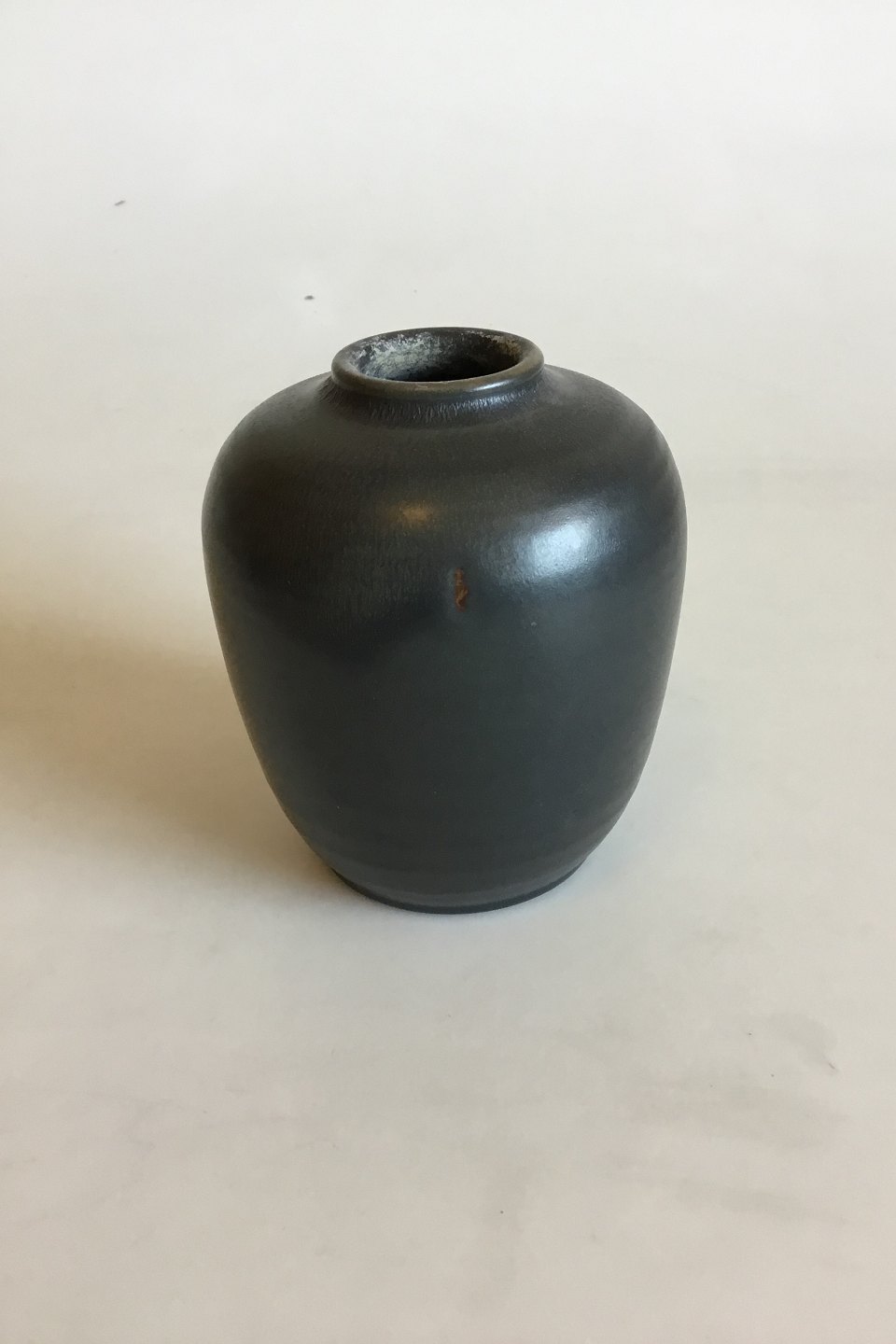 L. Hjorth Stentøjsvase med mørkegrå glasur. Måler 11 cm
