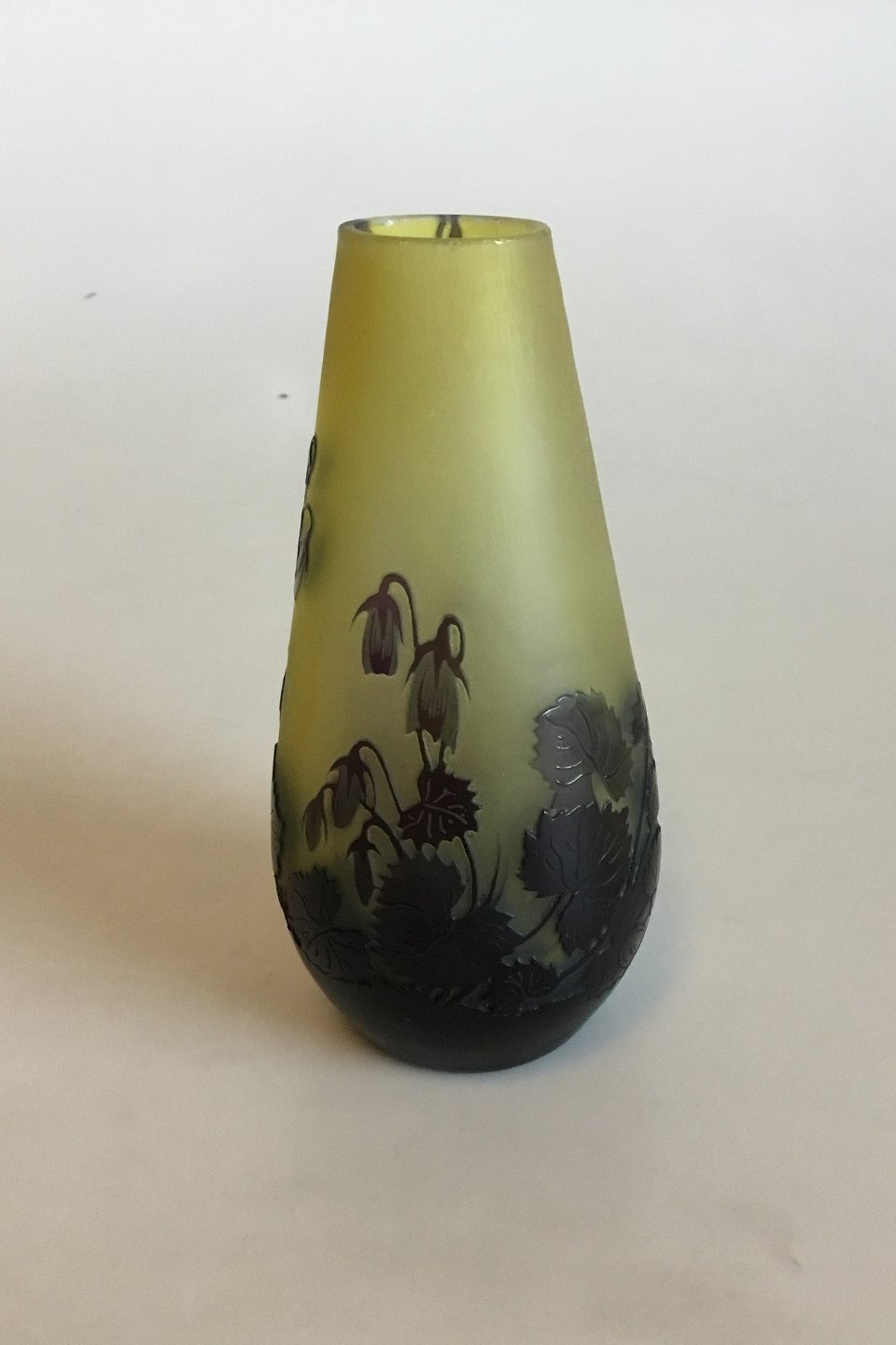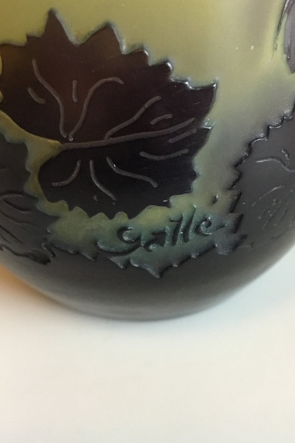 Émile Gallé Vase. Art Nouveau, Signeret. Grønlig matslebet vase med sort blomsterdekoration. Måler 15 cm