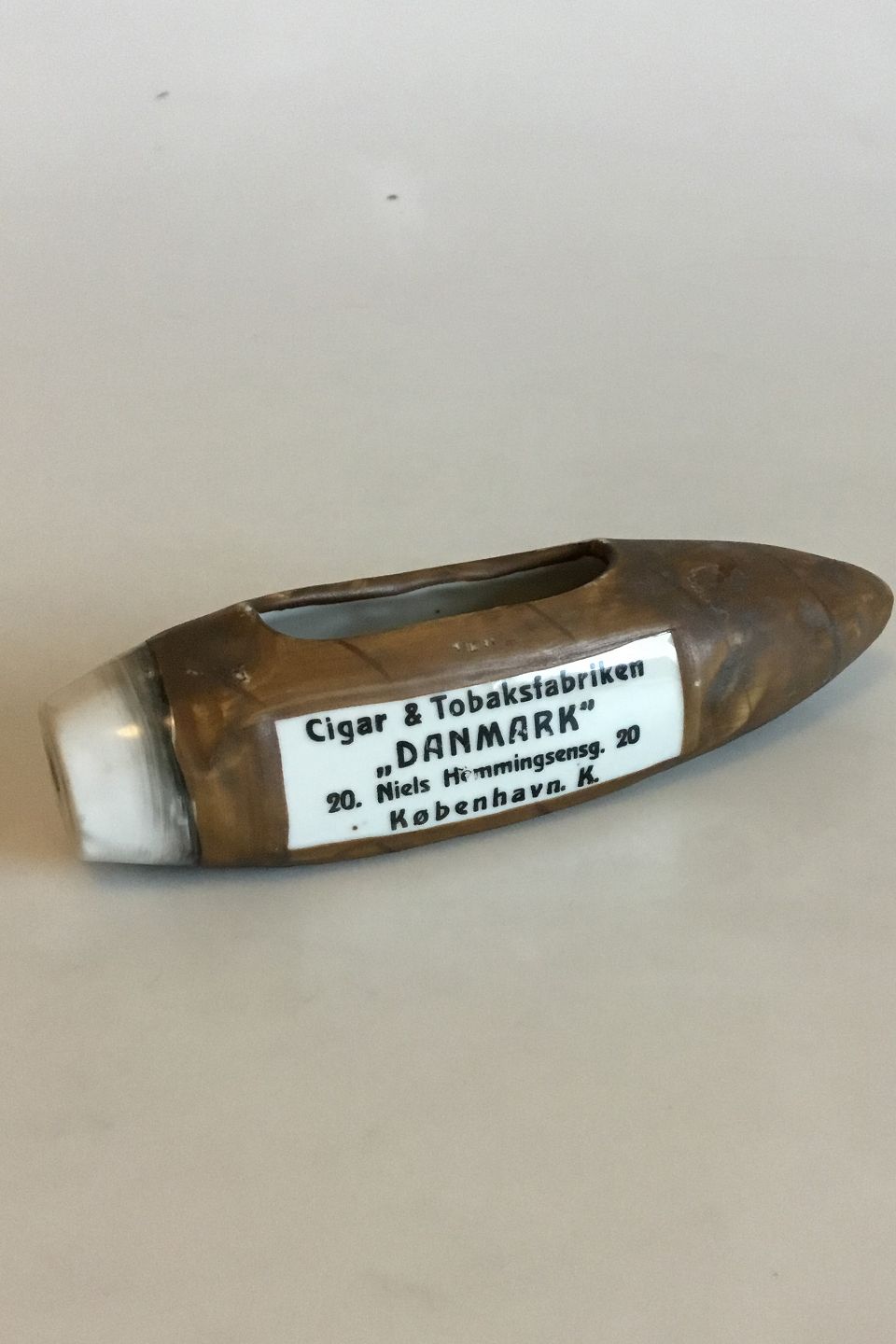 Cigar i porcelæn, gammel reklame for Cigar & Tobaksfabrikken "Danmark", Niels Hemmingsensgade 20, København K. Har været brugt som cigar askebæger. Måler 16 cm