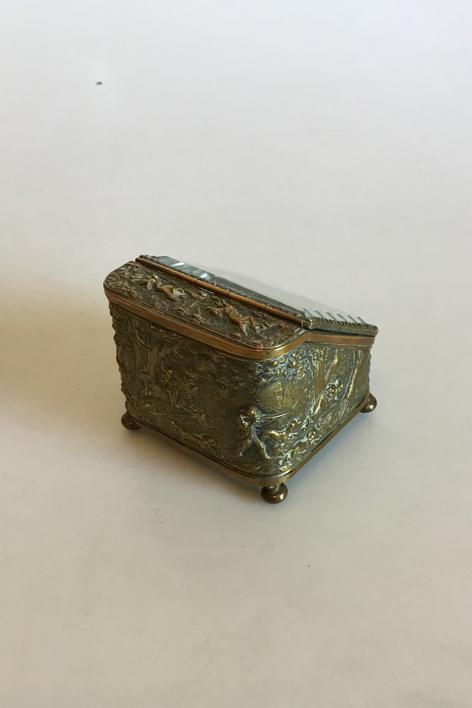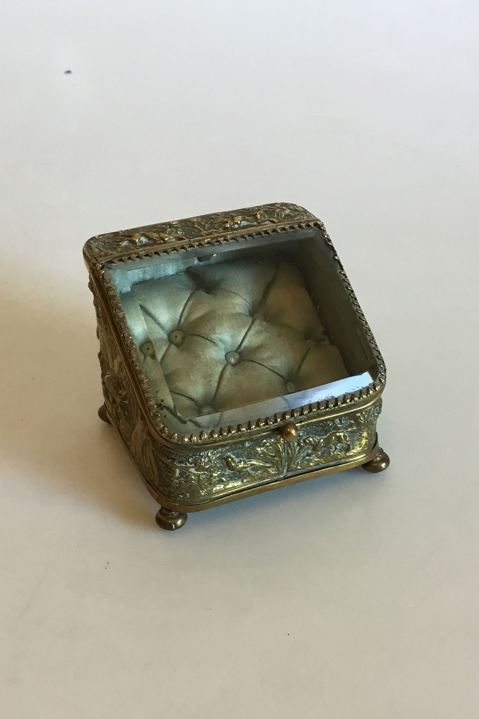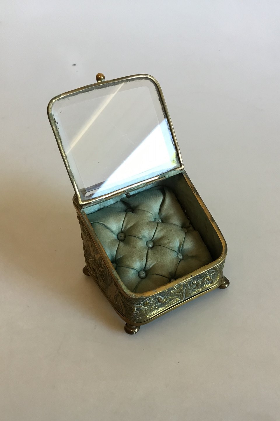Smykkeskrin i Messing med glaslåg. Måler 8 cm x 7,5 cm x 7 cm