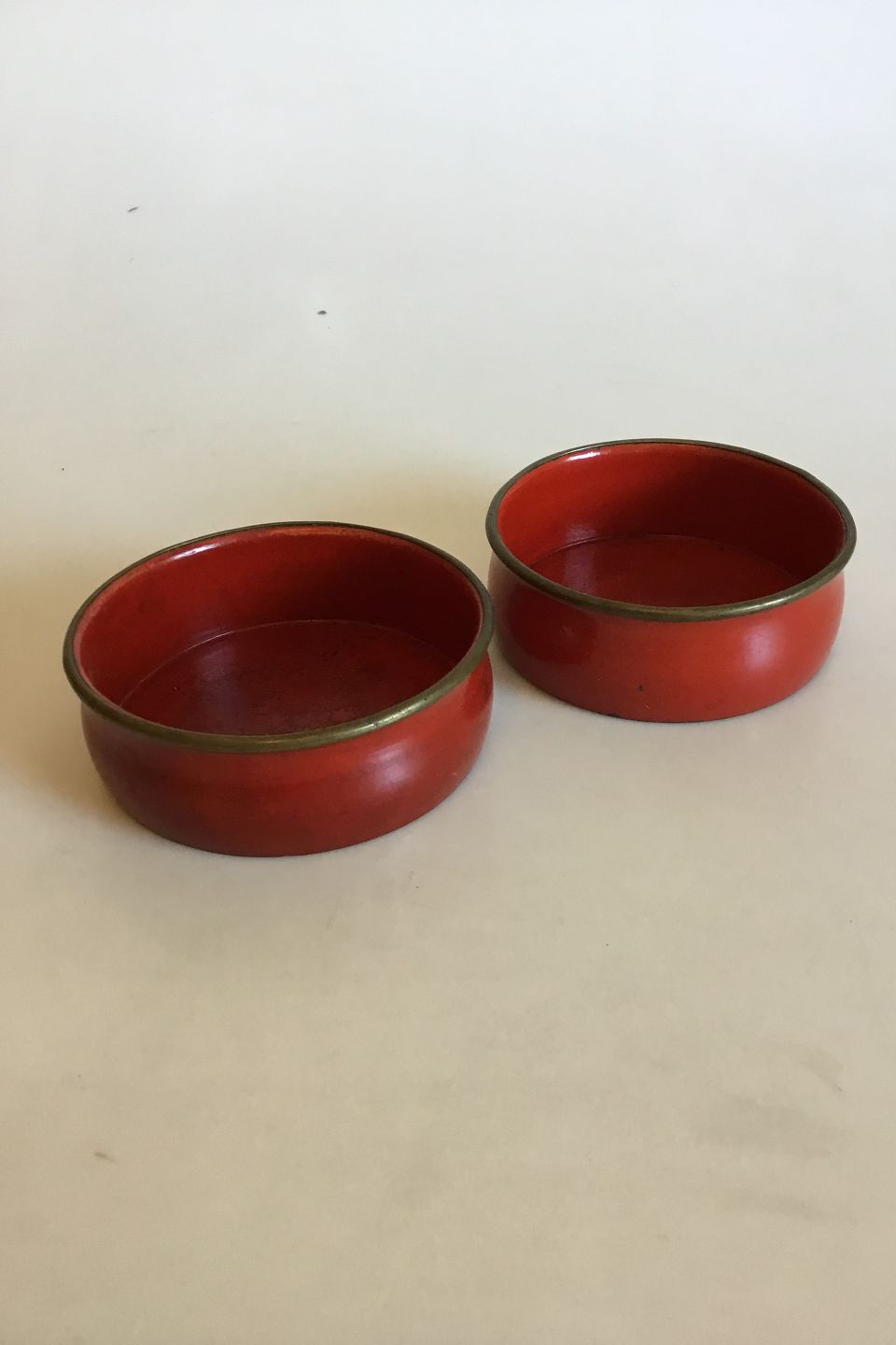 Engelsk Flaskebakke i papmaché med metalkant, Rødlakerede. Ca. 1840. Måler 12,5 cm dia. x 4,5 cm.