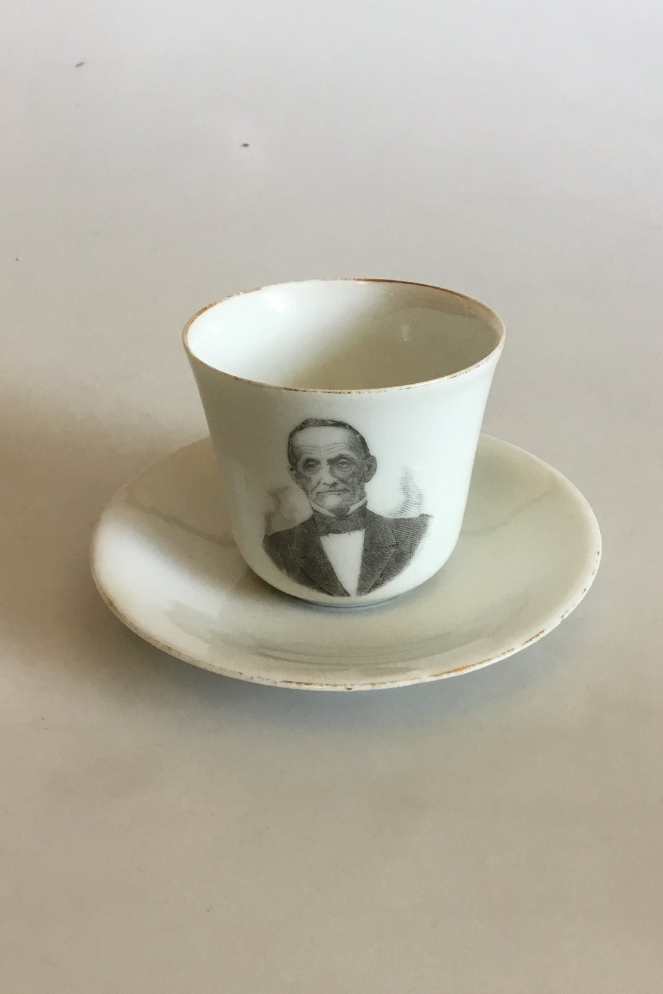 Bing & Grøndahl 6 kaffekopper med underkopper med portrætter af Venstrepolitikere. Chresten Berg (1829-1891), Frede Bojsen(1841-1926) , En ukendt kvinde, C. C. Alberti(1814-1890), Ludvig Holstein- Ledreborg (1839 - 1912), Balthazar Christensen(1802-1882). Fra 1875-80. Måler ca. 6,5 cm. Brugsslitage og afslag.