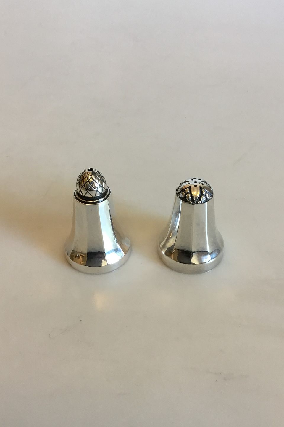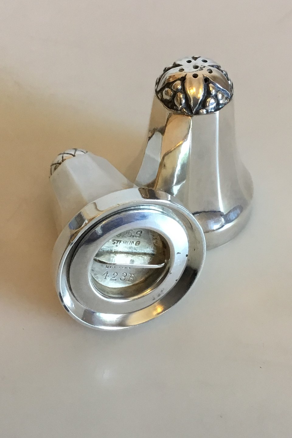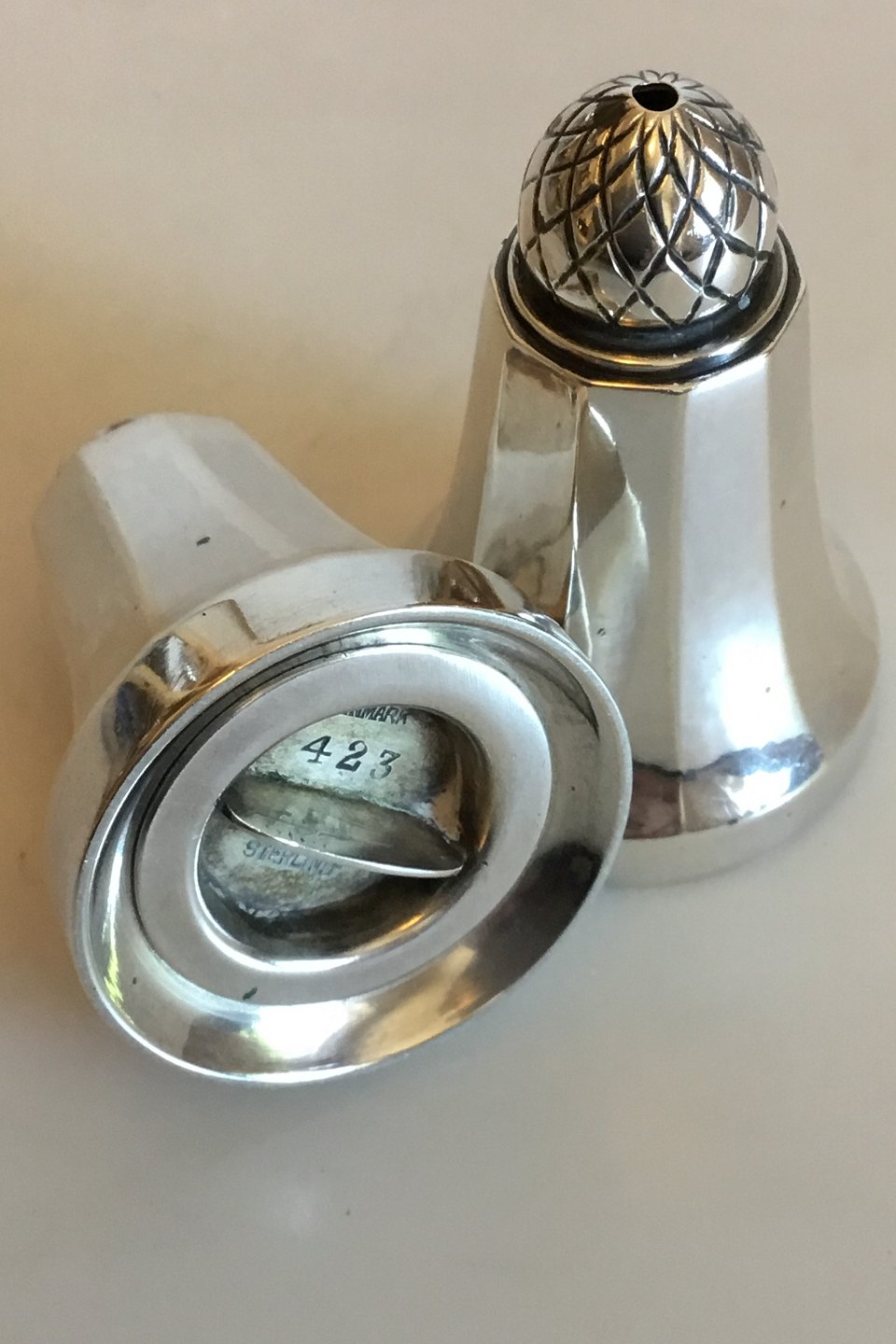 Georg Jensen Sterling Silver Salt and Pepper Shaker No 423 and No 423B. Measures 3.5 cm / 1 3/8 in. and 4 cm / 1 37/64 in. Weighs combined 34 g / 1.20 oz.