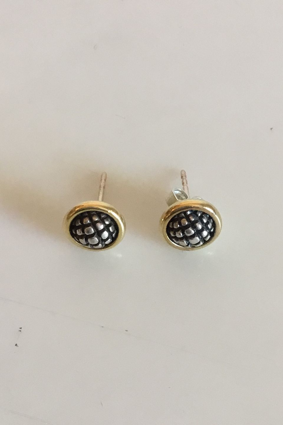 Georg Jensen Sterling Sølv Ørestikker No 425. Oxideret og Forgyldt Sterling Sølv Ørestikker designet af Lene Munthe for Georg Jensen. Måler 0,9 cm. Vejer tilsammen 4 gram