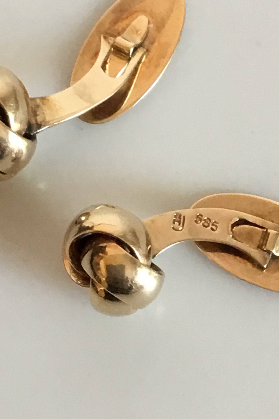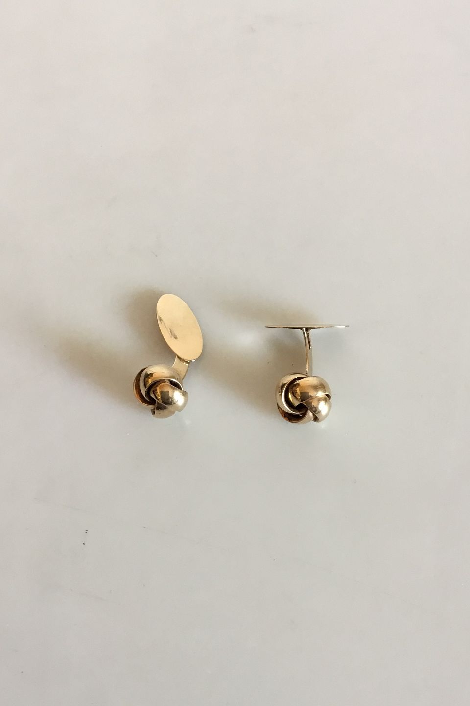 Manchetknapper i 14 K. guld. Måler 1,2 cm dia. Vejer tilsammen 4,37 gram. Stemplet 585 AJ (Arne Johansen)