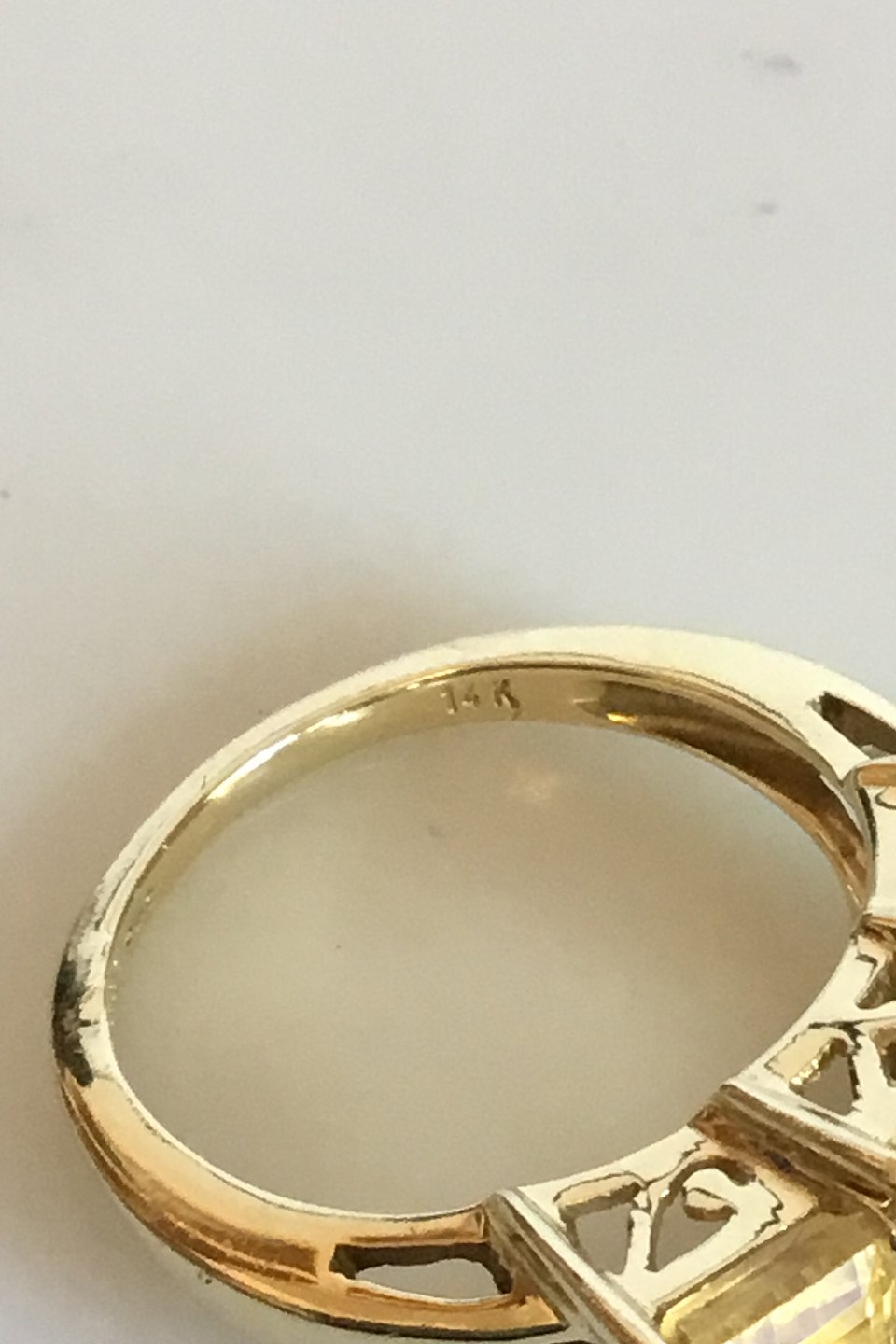Gold Ring with three yellow stones. 14 K. Ring size 55 / US 7. Weighs 5.09 g / 0.18 oz. Stamped SGI ERC 585 (Elisabeth Rosenberg Christensen)