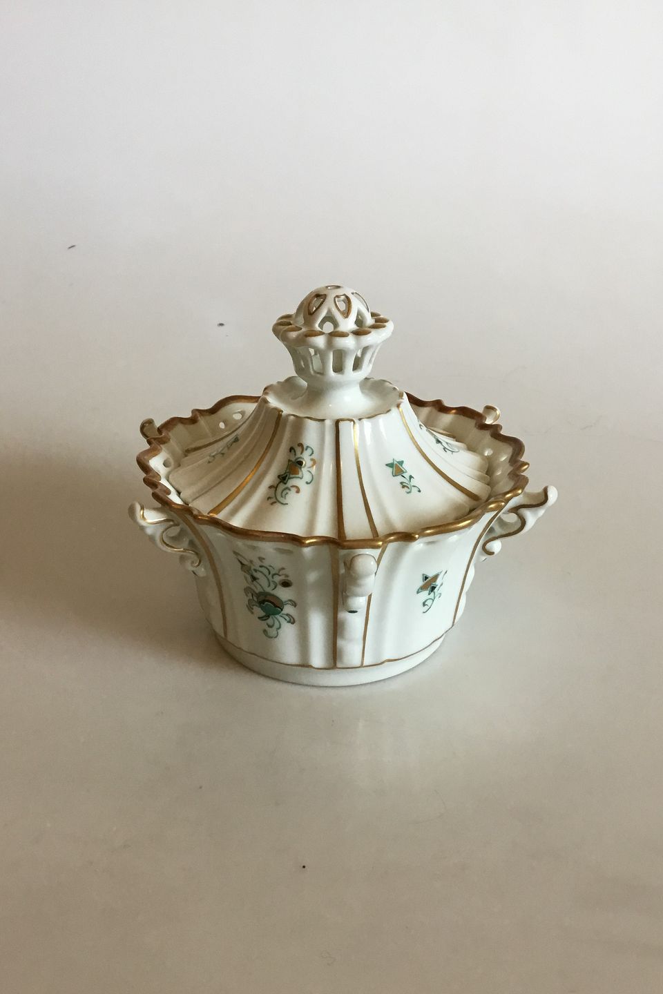 Dahl Jensen Dronning Sukkerskål med guld og gennembrudt kant. Måler 13 cm