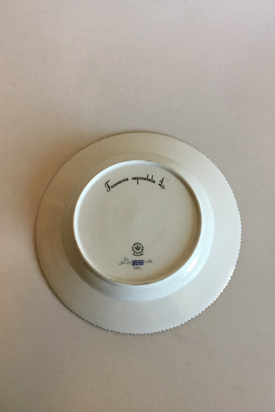 Royal Copenhagen Flora Danica Plate No 20/3549. Measures 25.8 cm / 10 5/32 in. 1st Quality. Latin name: "Fumaria capreolata L."