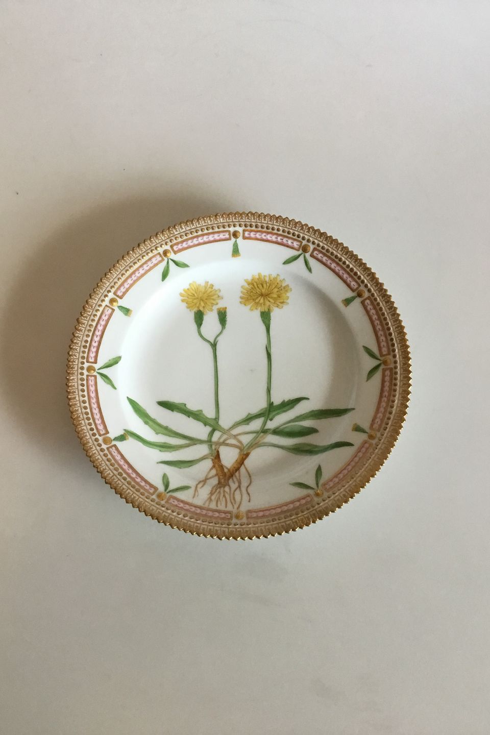 Royal Copenhagen Flora Danica Frokosttallerken No 20/3550. Måler 22 cm. 1. Sortering. Latinsk navn: "Leontodon autumnalis S B nigro-lanatus Fr."