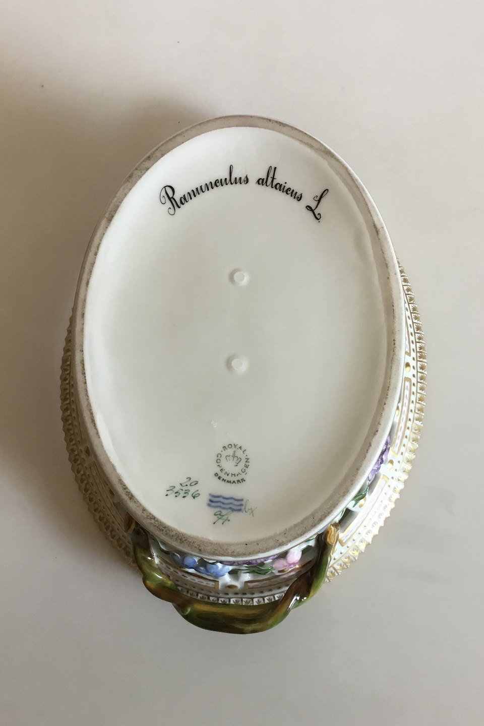 Royal Copenhagen Flora Danica Fruit Basket No 20/3536. Measures 25.5 cm / 10 3/64 in. x 19 cm / 7 31/64 in. x 8.5 cm / 3 11/32 in. 1st Quality. Latin name: "Ranunculus altaicus L."