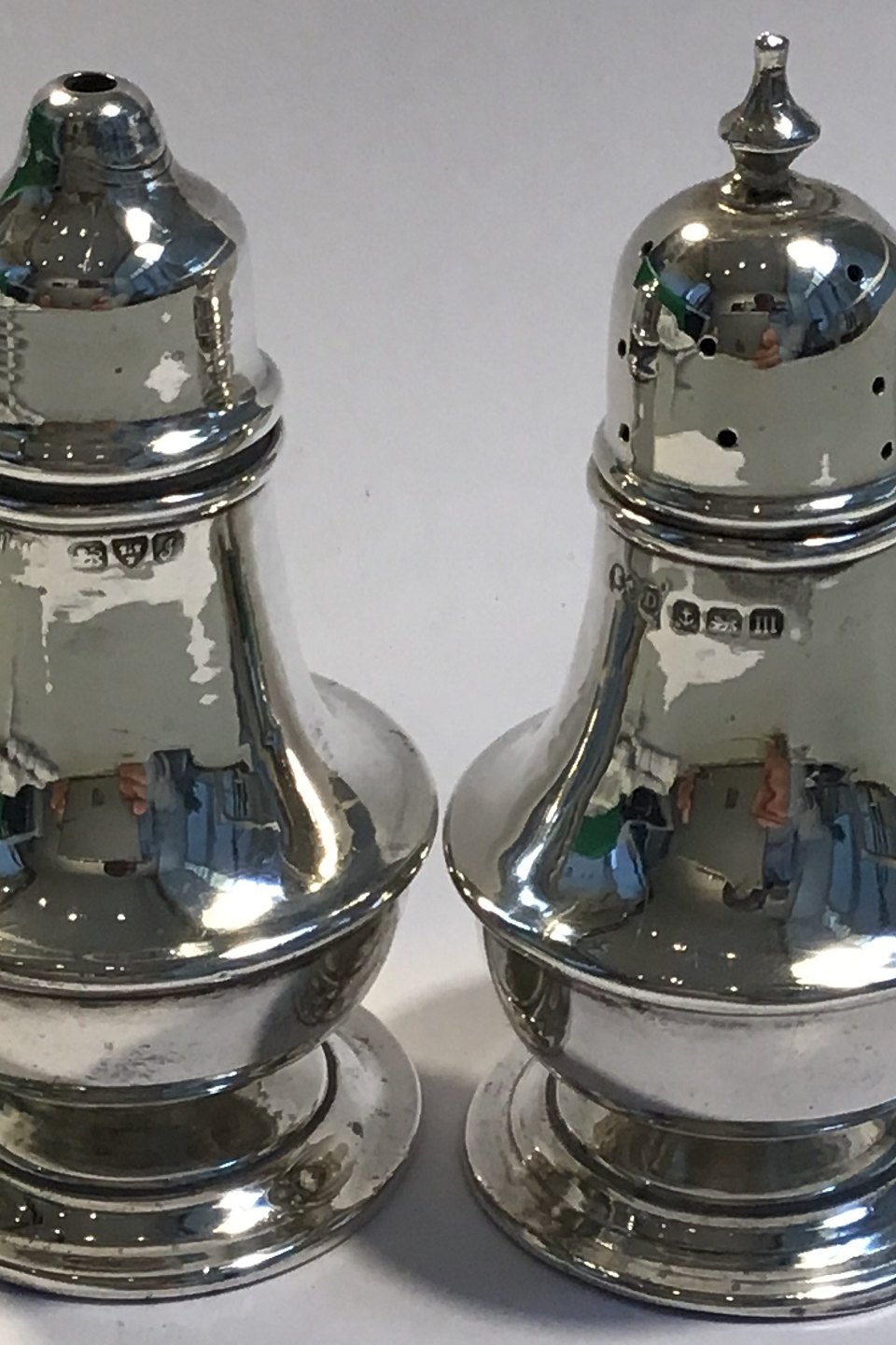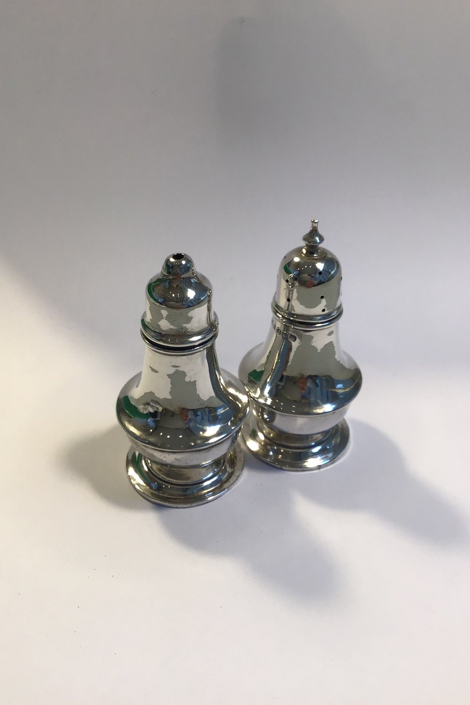 English Salt & Pepper shakers on raised base. Hallmarked Chester and Birmingham H 7 cm/2.75"