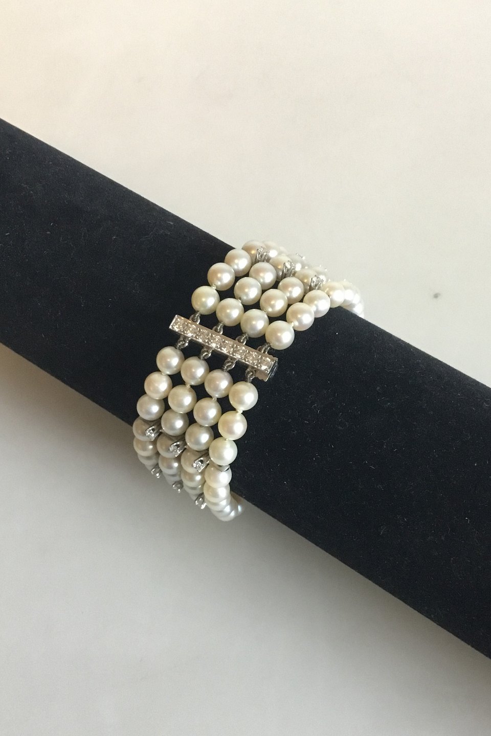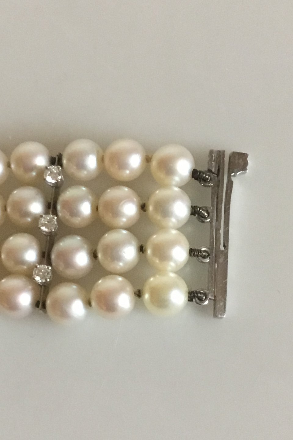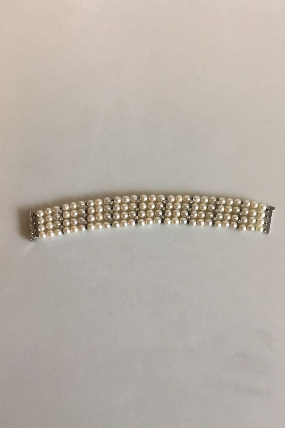 Georg Jensen & Wendel 14 K Hvidgulds armånd med perler og brillanter. Består af 108 perler og 32 brillanter. Måler 20 cm. Vejer 50,3 gram