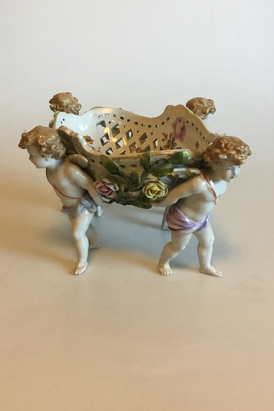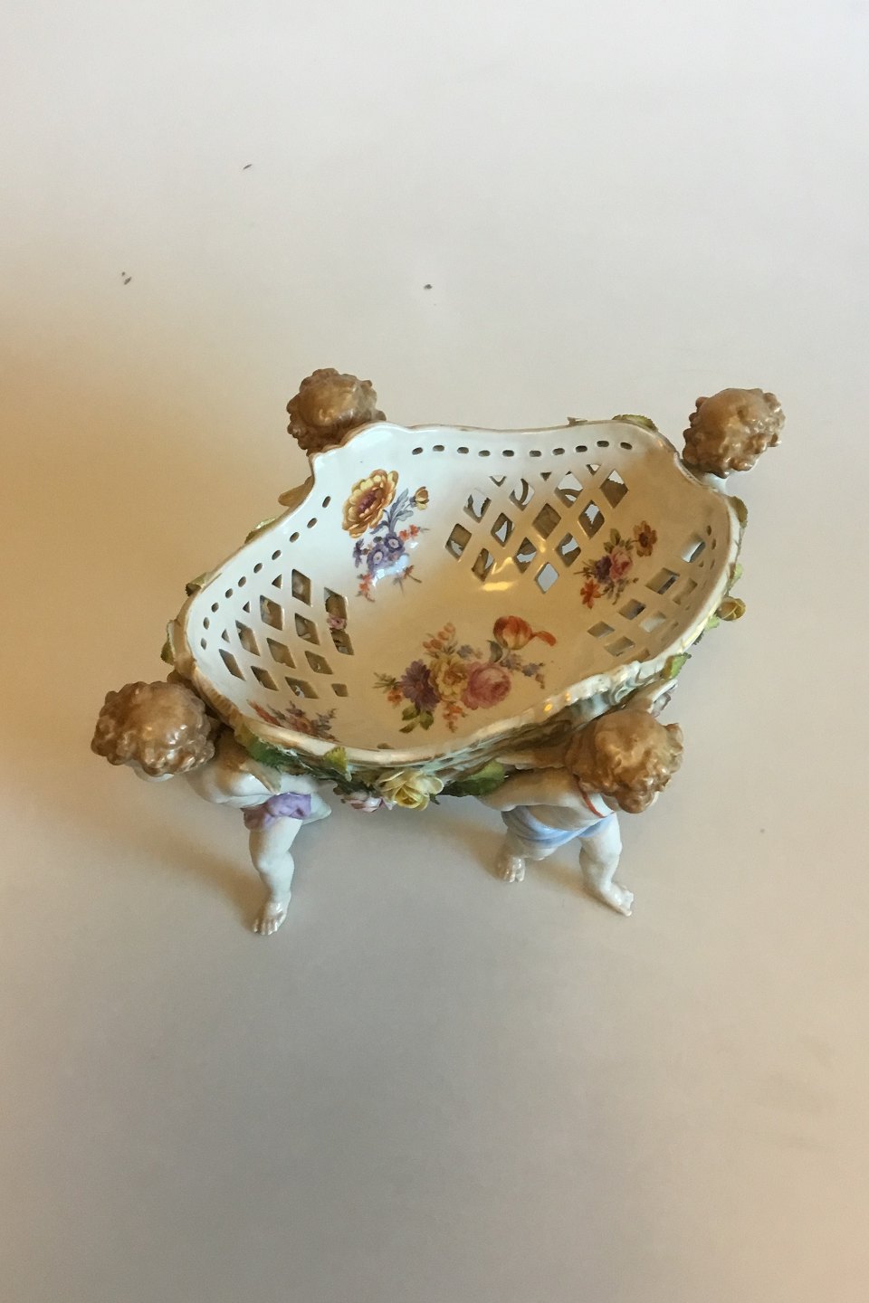 Stor bordopsats af porcelæn, rigt modelleret og prydet med pousserende blomster, dekoreret i farver og guld, båret af fire putti. Plaue mærke, fra 1916. Måler 31 cm x 16 cm. Afslag på en fod