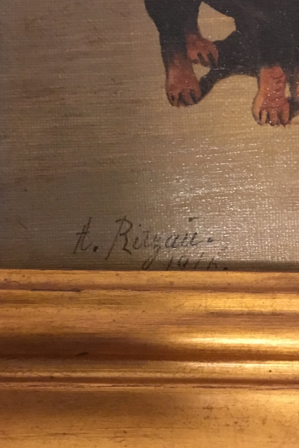 Maleri, olie på lærred i guldramme, af gravhunde. Signeret A. Ritzau 1916. Måler 35 cm x 44 cm